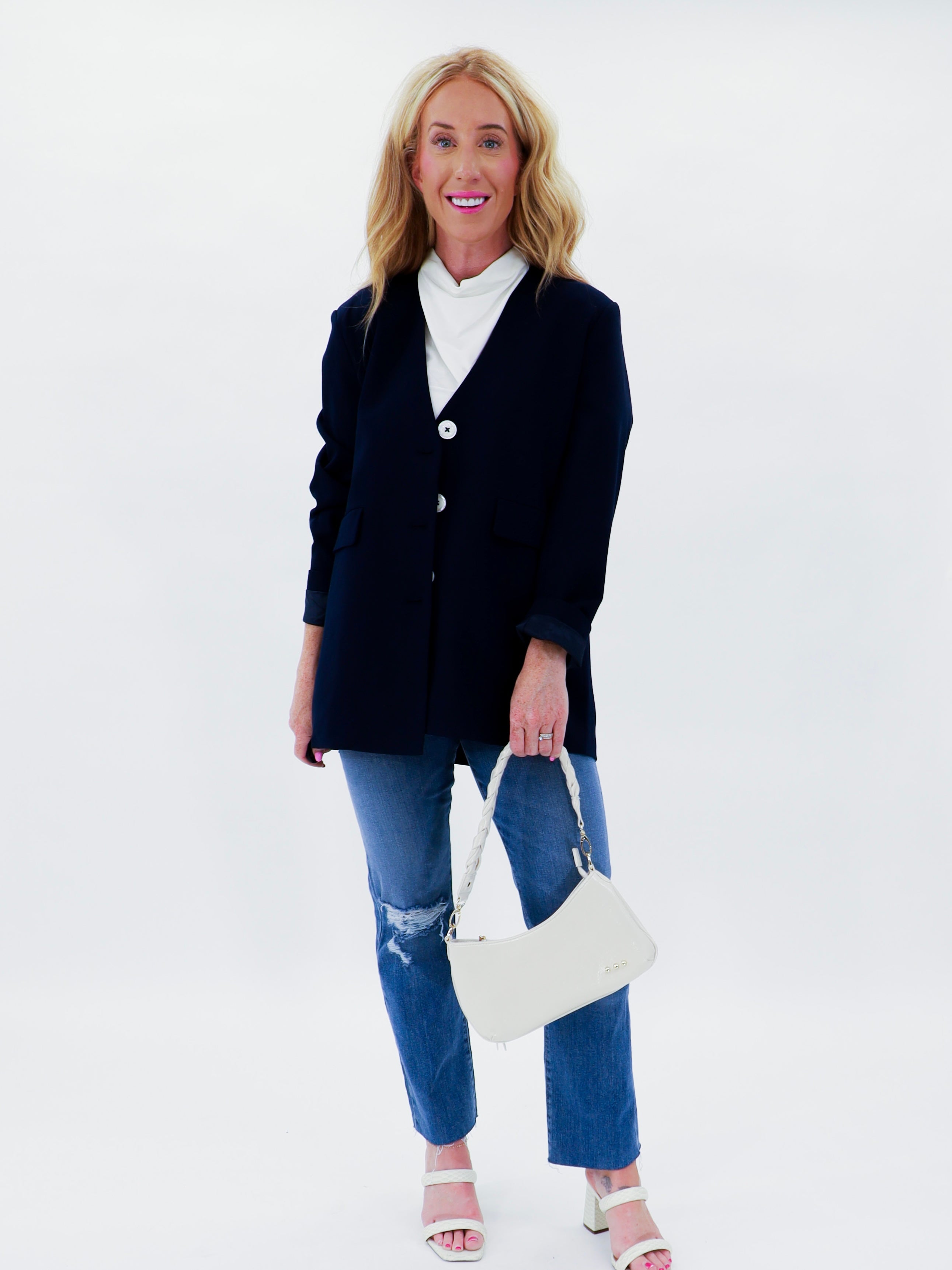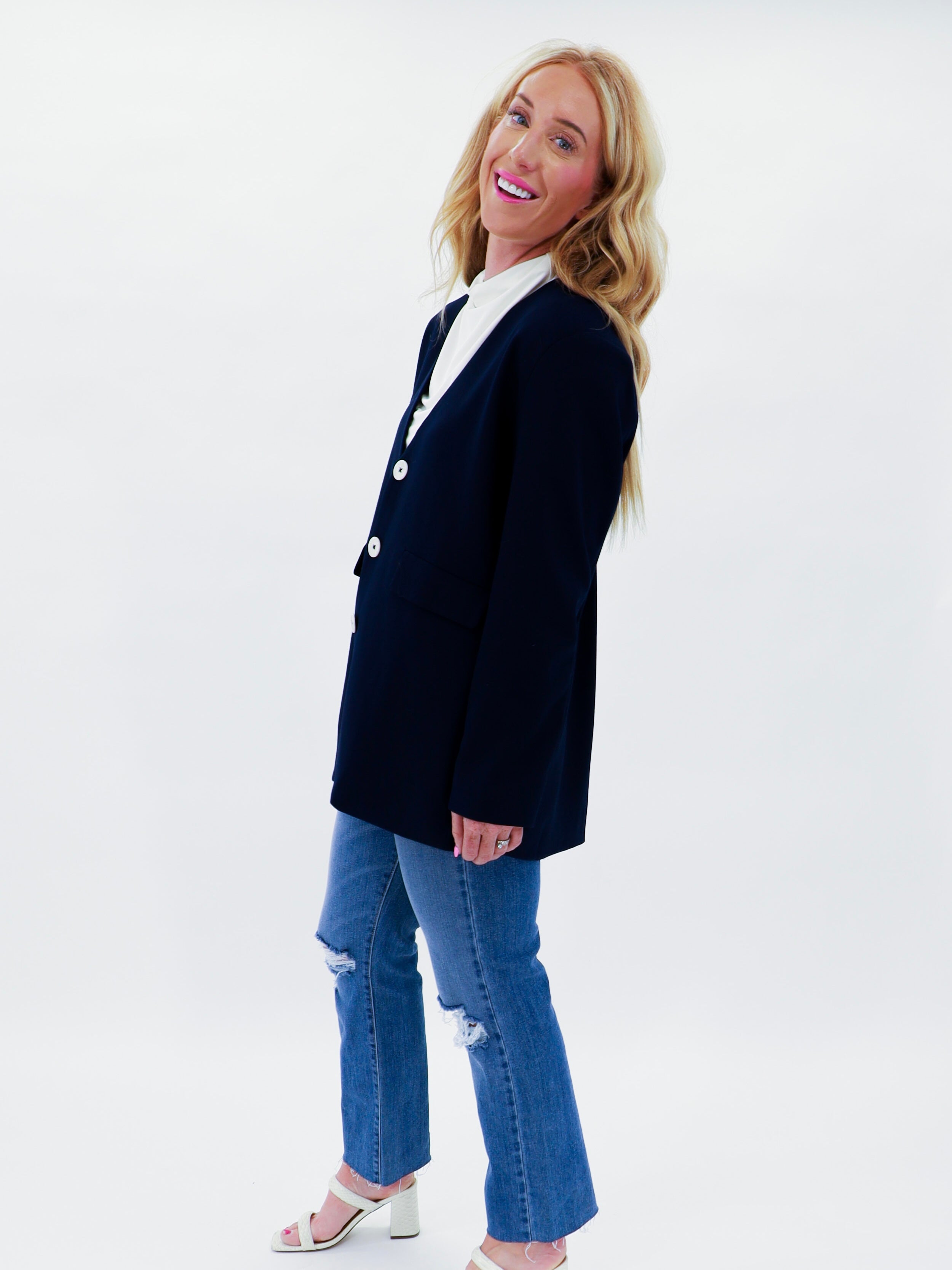 Ladies, prepare to elevate your fashion game with our beloved Eleanor Blazer! This oversized stunner pairs perfectly with Any Wide Leg Denim, a simple white tank, and darling ballet flats.