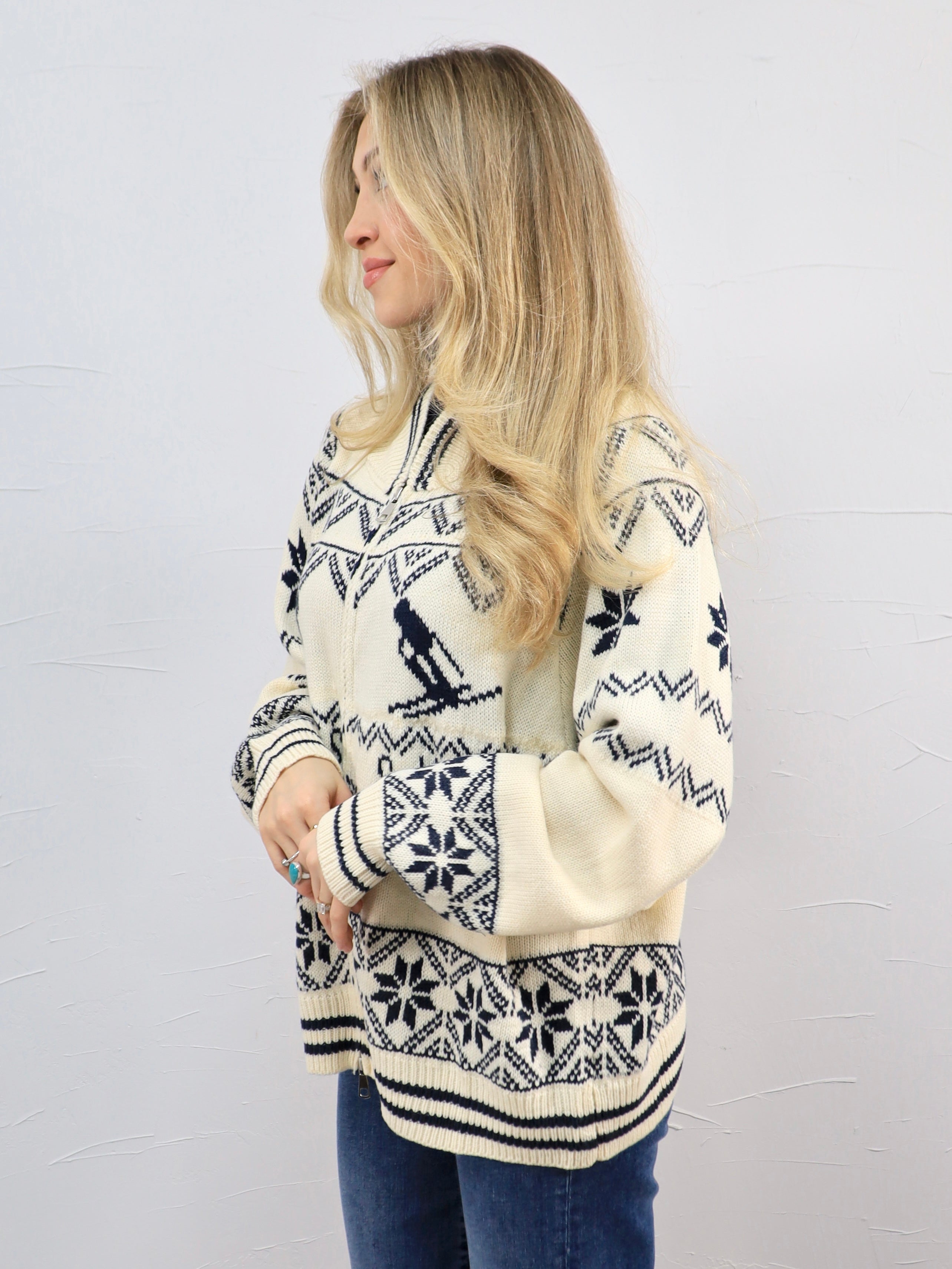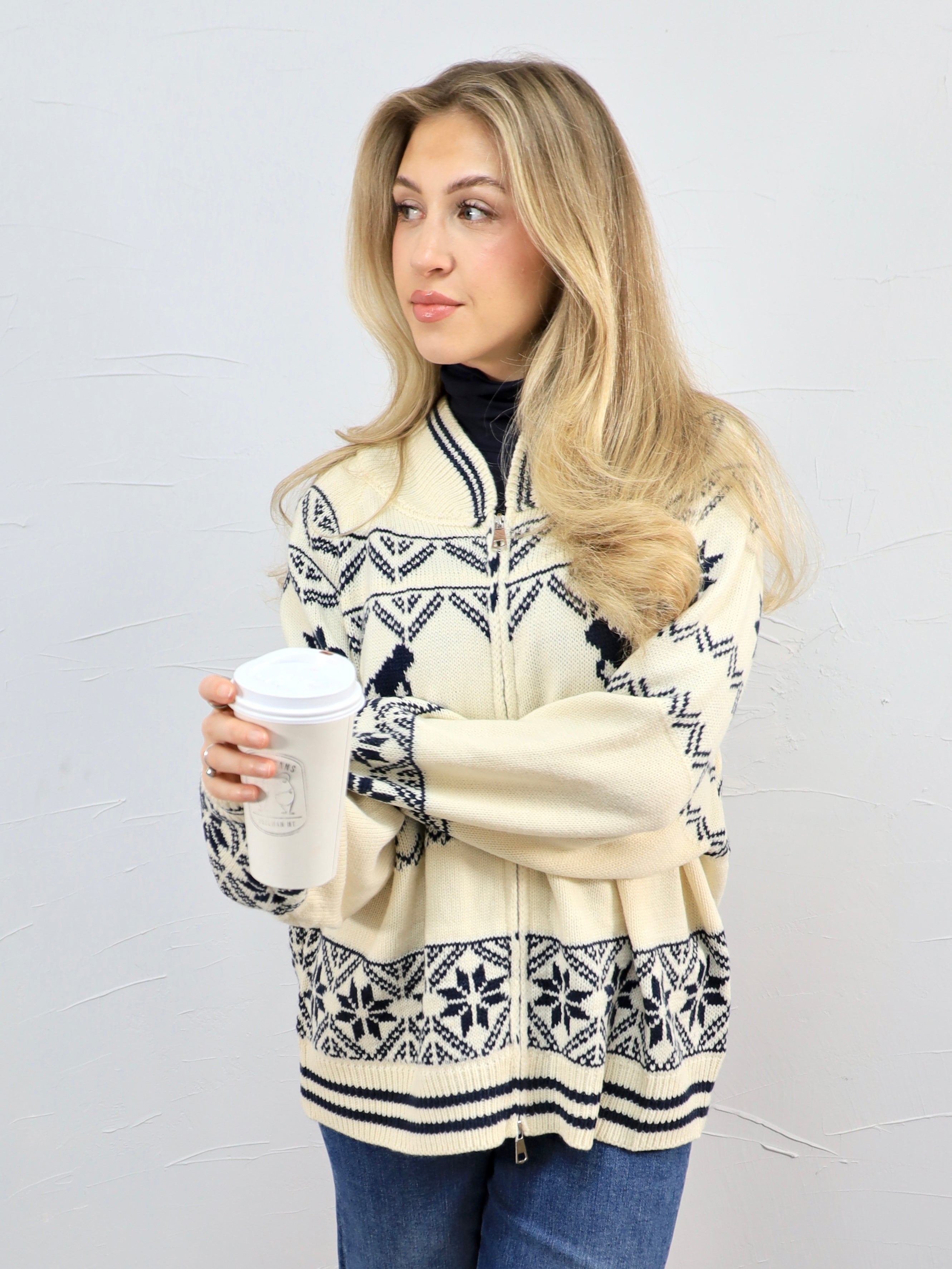 - Soft, chunky knit with a cozy zip-front design