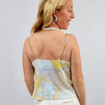 The Golden Hour Tank is giving soft summer glam in the prettiest way. With a slouchy, relaxed fit and delicate gold chain straps, this top brings just the right amount of shimmer. The pastel paisley print is light, airy, and oh-so dreamy—perfect for sunny days or starry nights.