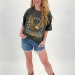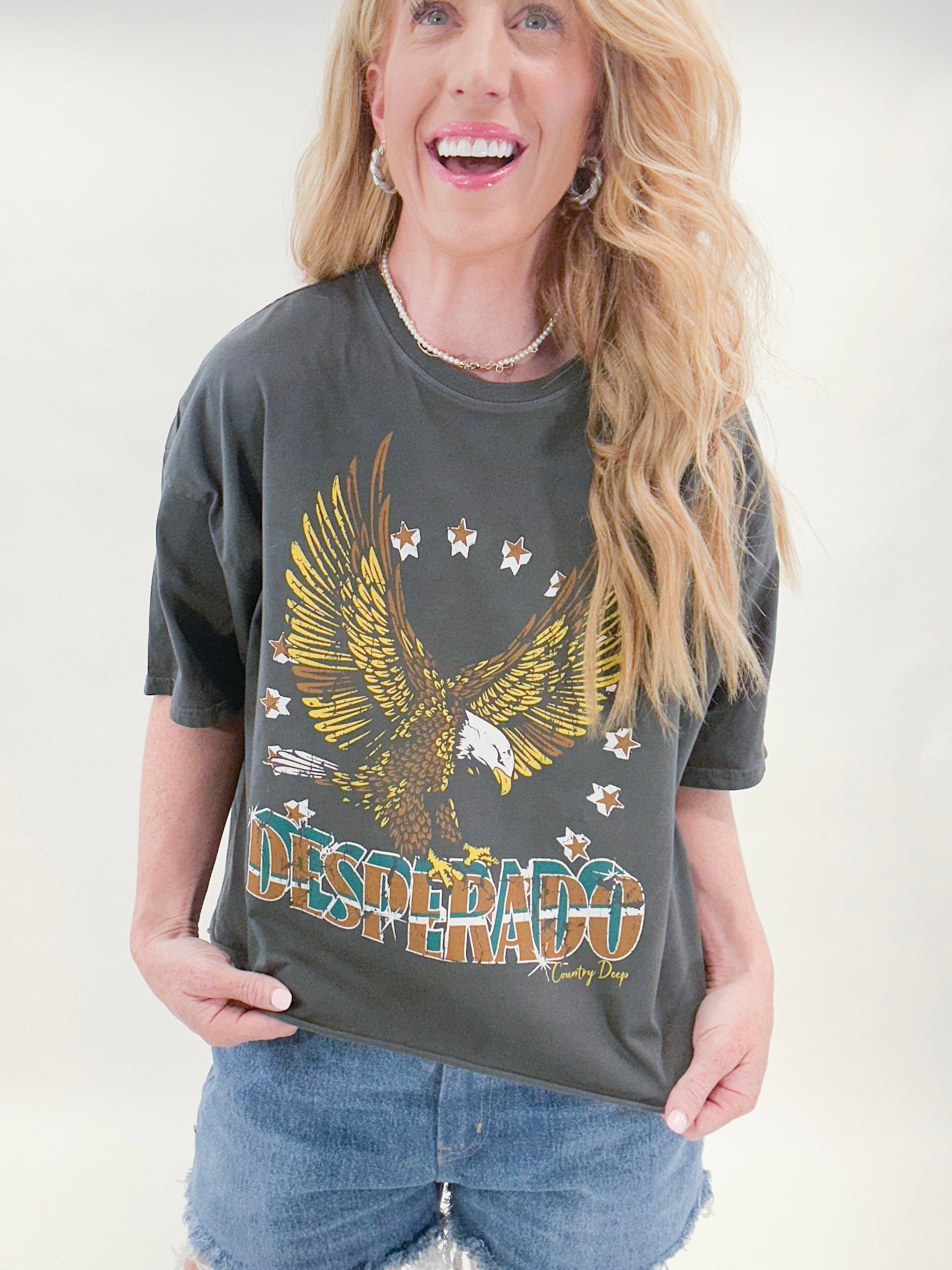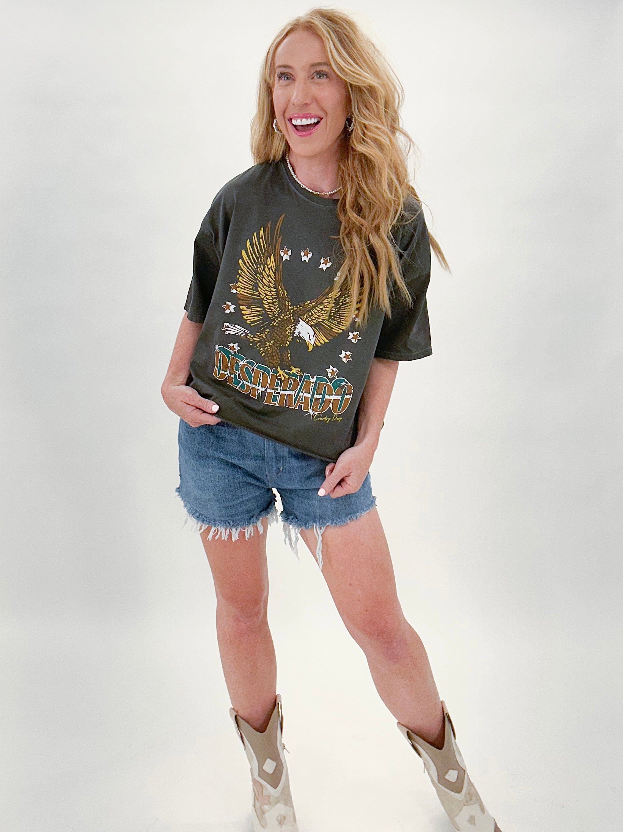 Level up your graphic game with this Desperado Cropped Graphic! It's a must-have for any denim-and-boot-loving cowgirl. Yeehaw!