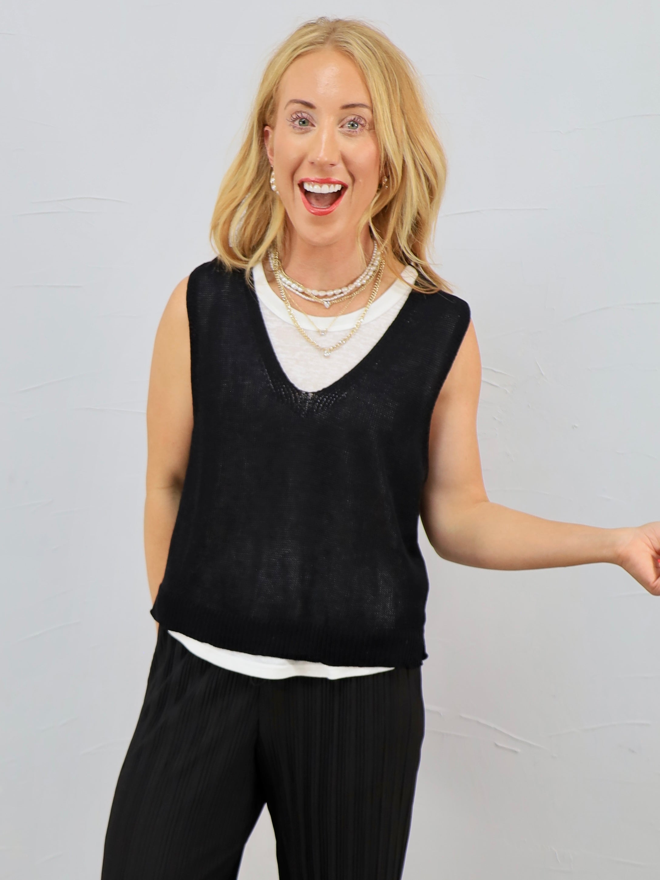 Effortlessly cool and easy to style, this lightweight sweater vest adds the perfect layer to your everyday look. Wear it over a simple tee with denim for casual errands or pair it with trousers for a polished coffee date or workday outfit.
