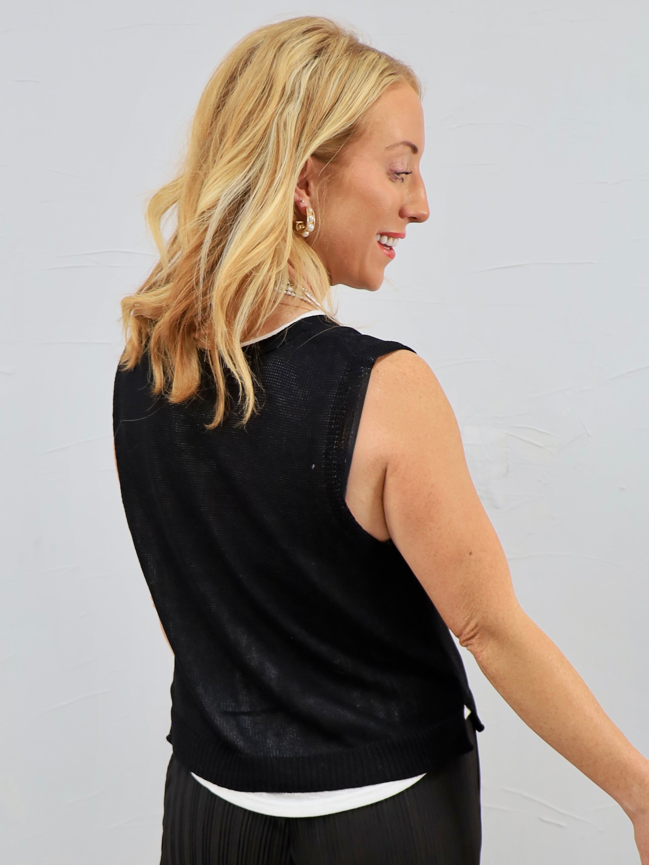 • Sleeveless silhouette perfect for layering