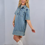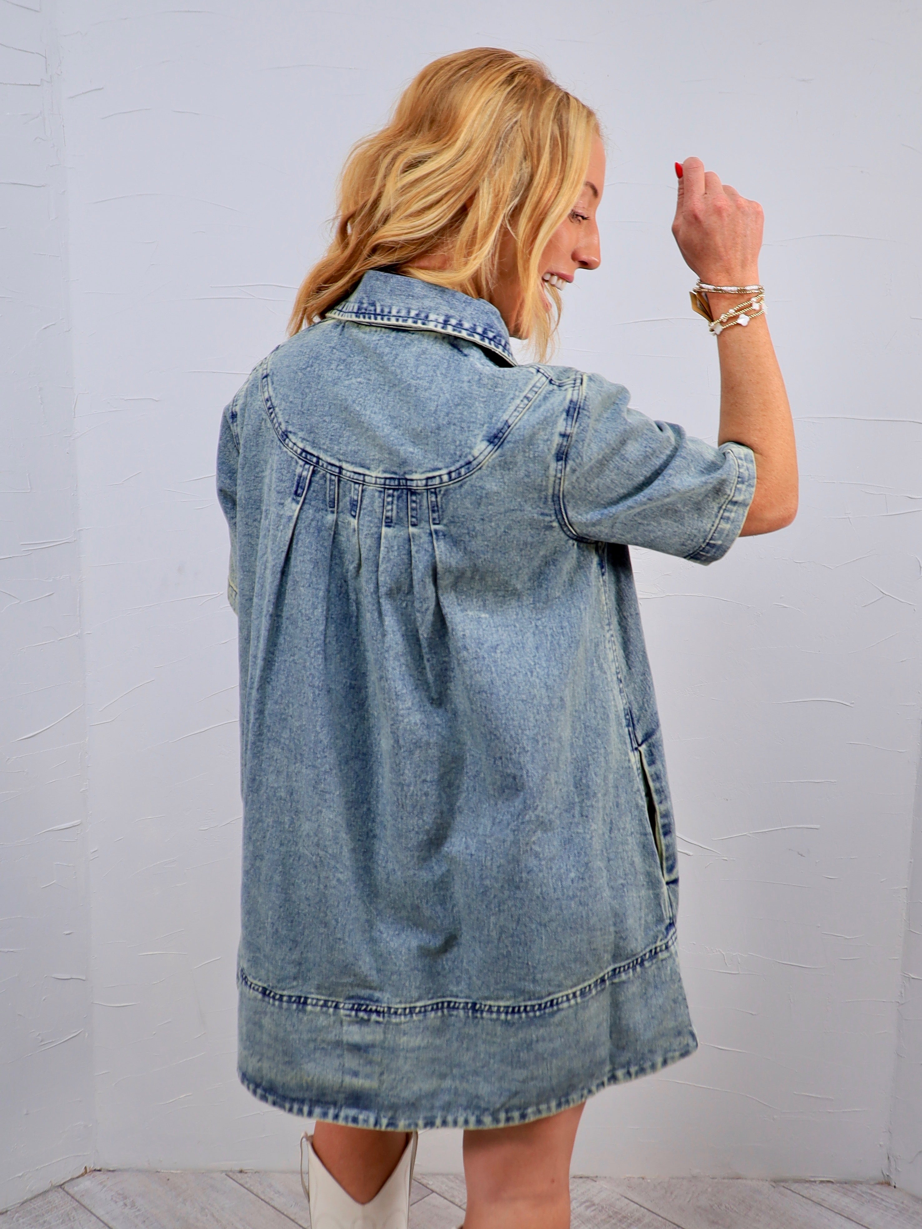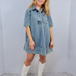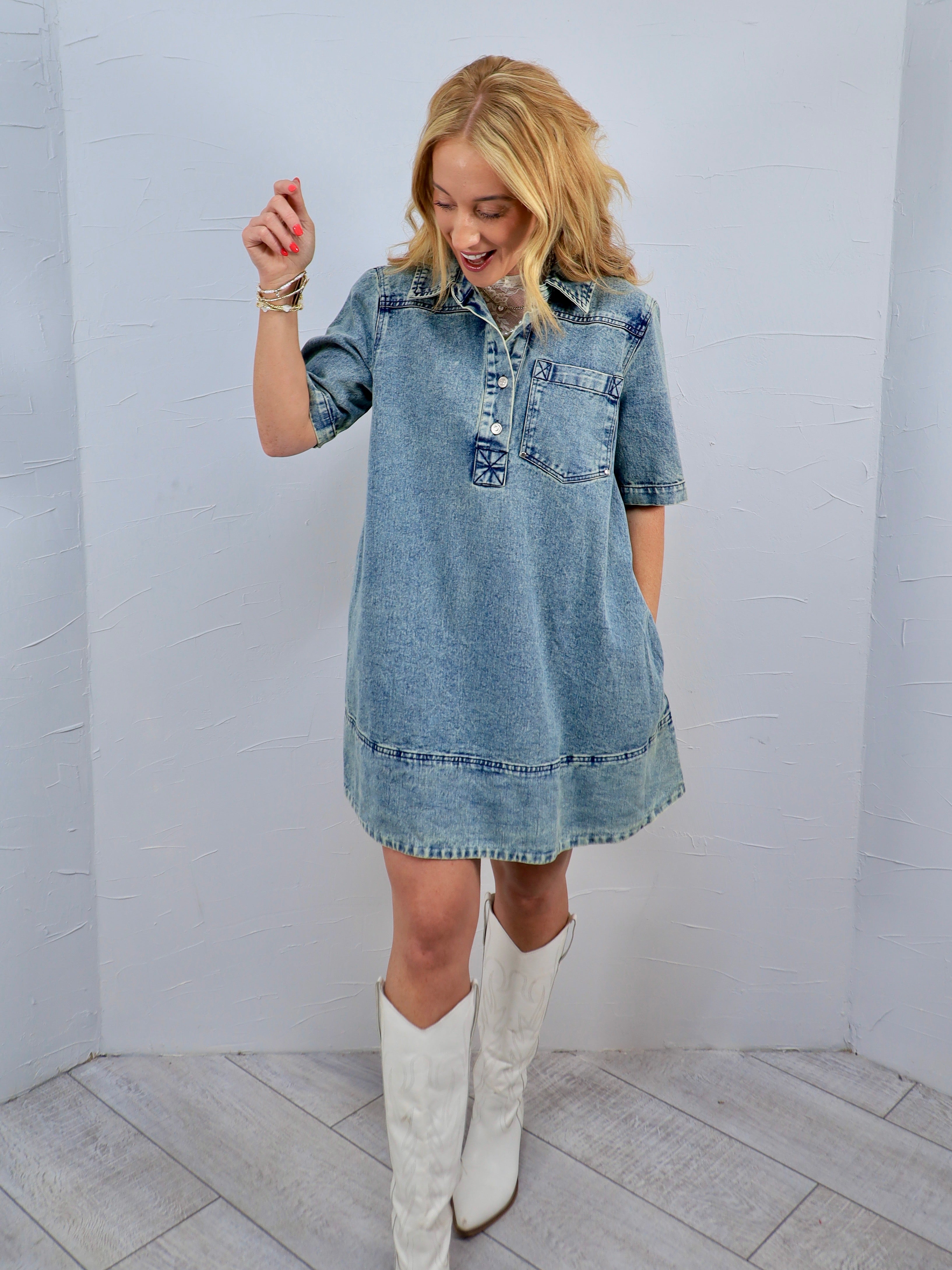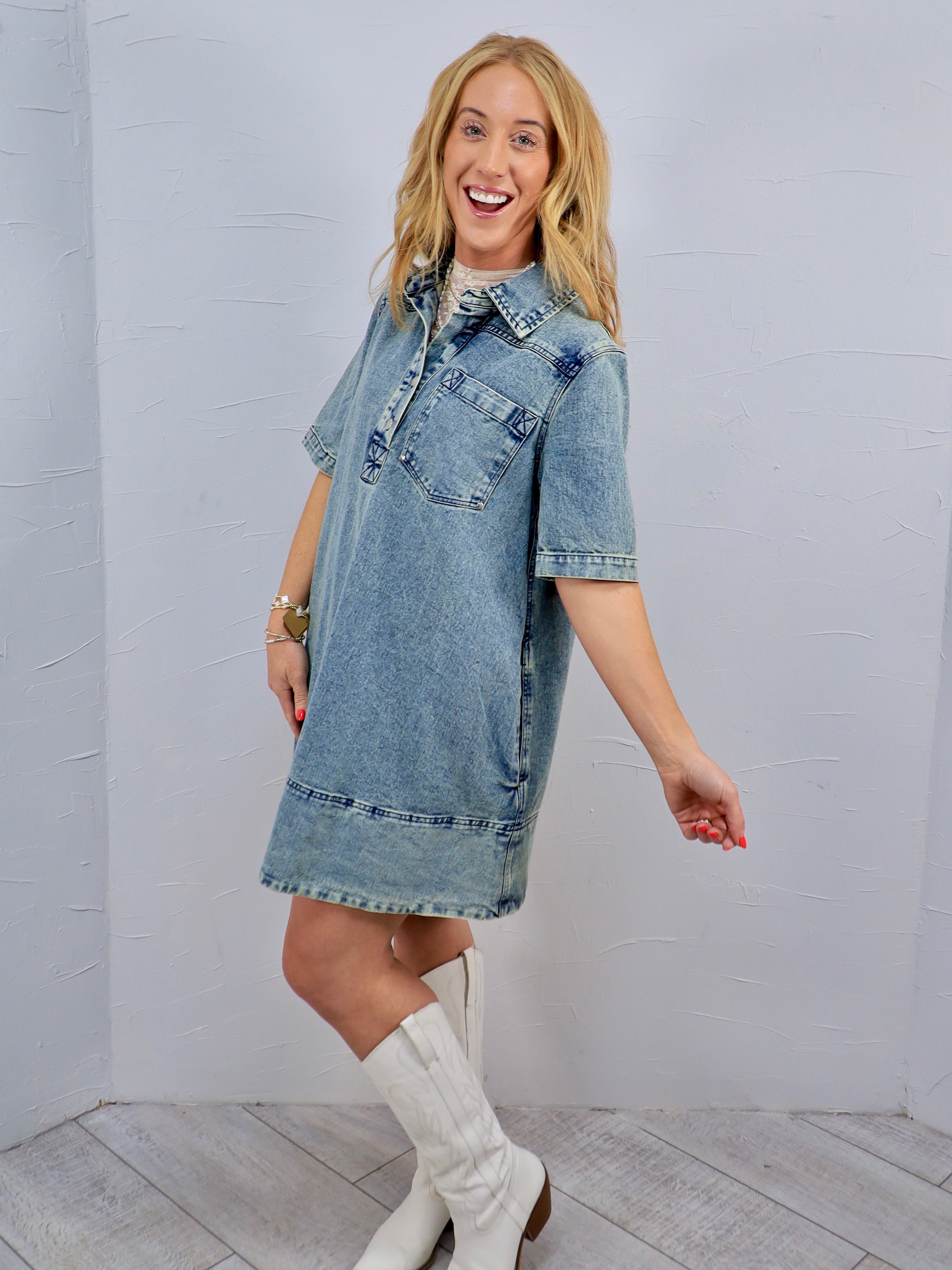 Our Drew's Denim Dress is perfect for so many occasions. Think rodeo, besties night out, brunch, or dinner with your sweetie. Get your favorite pair of boots ready to make the outfit shine.