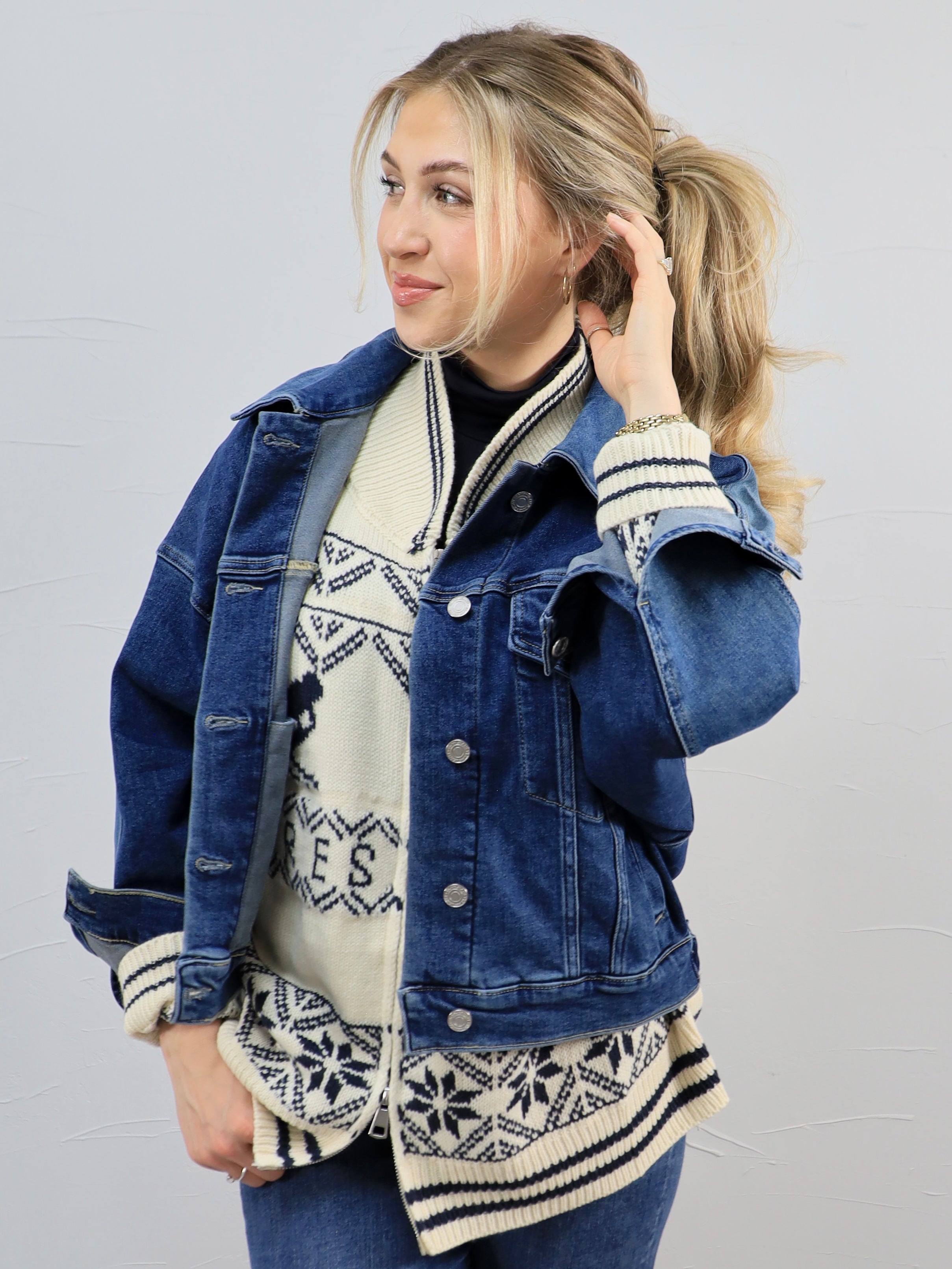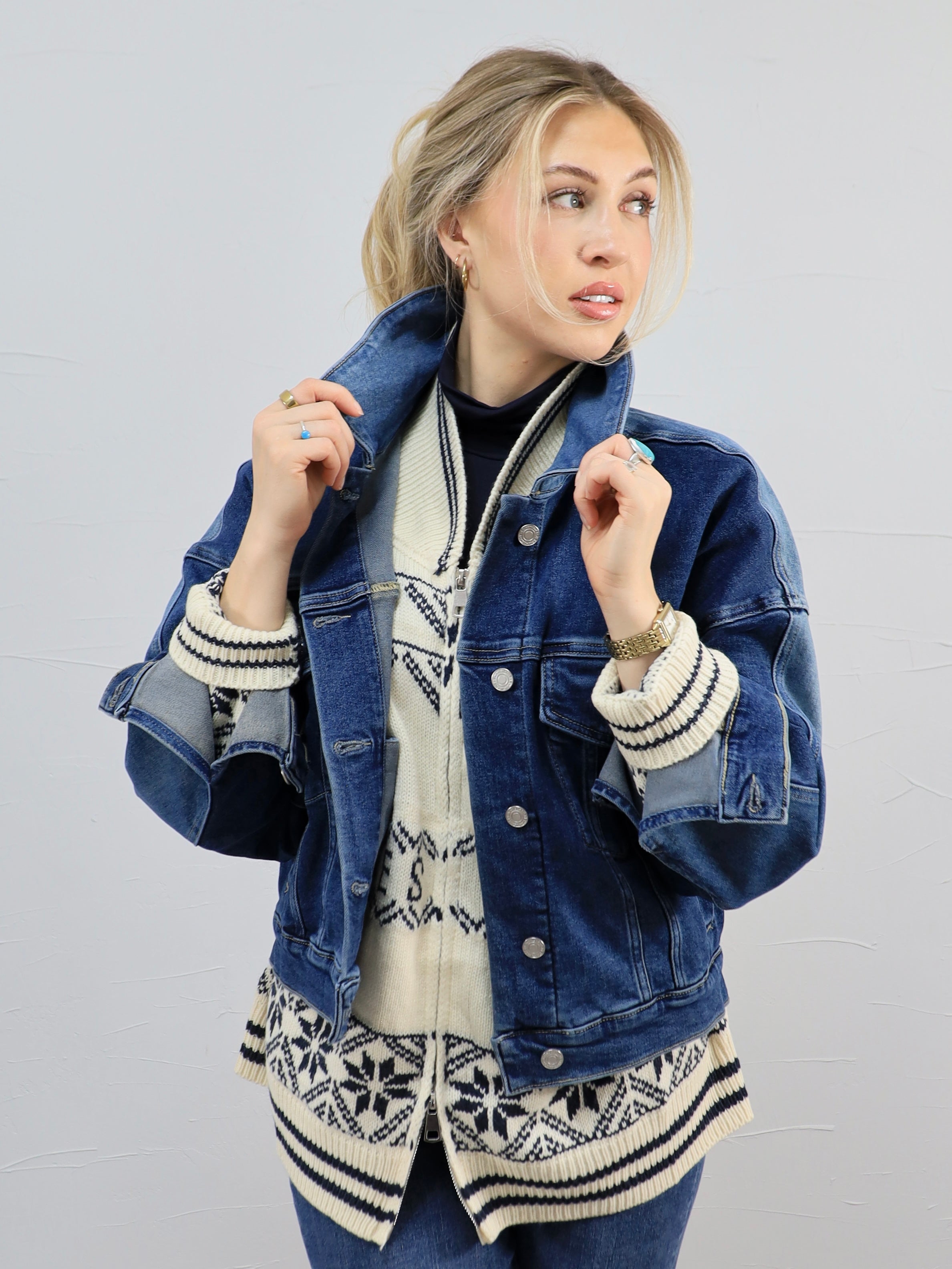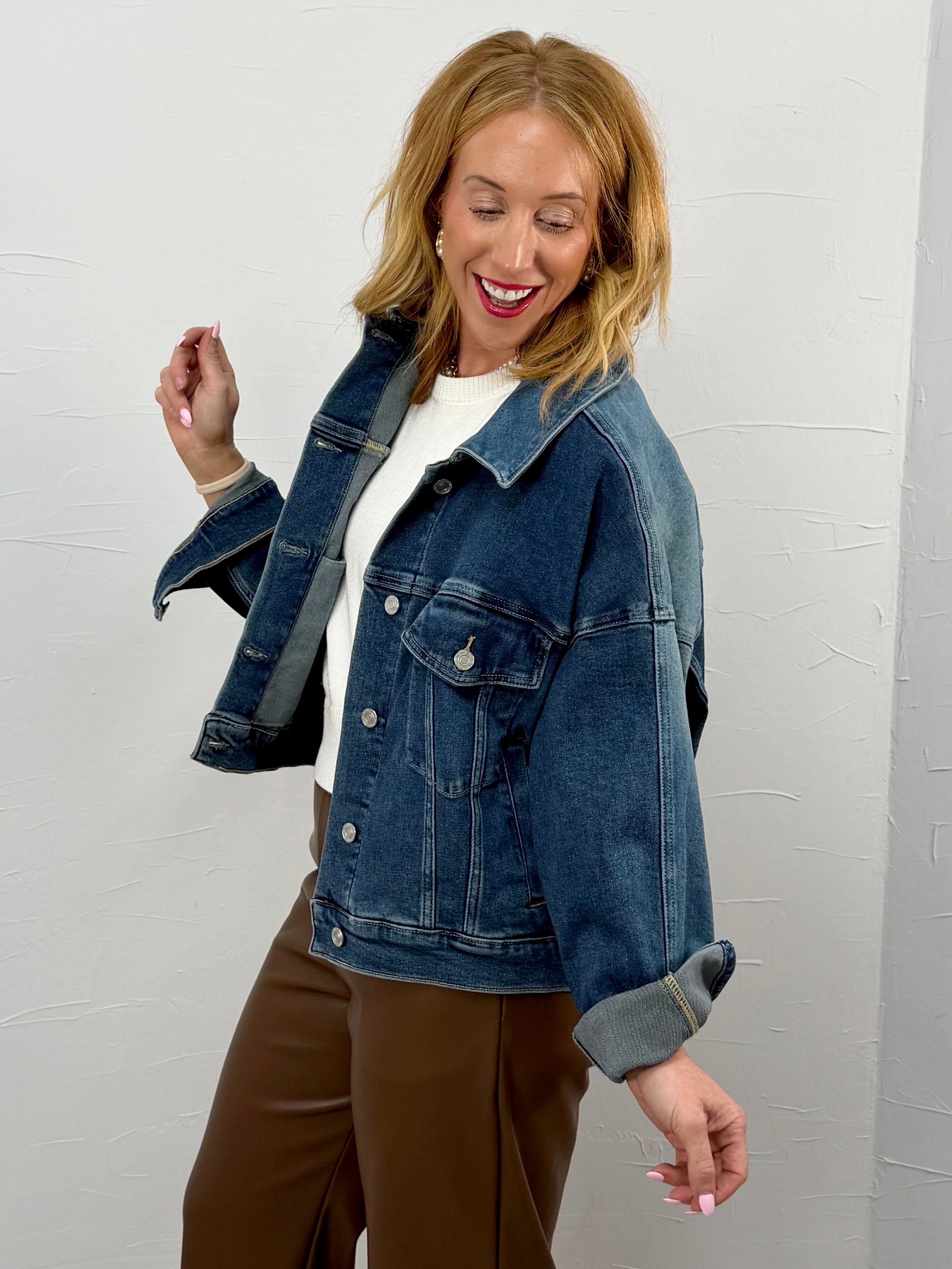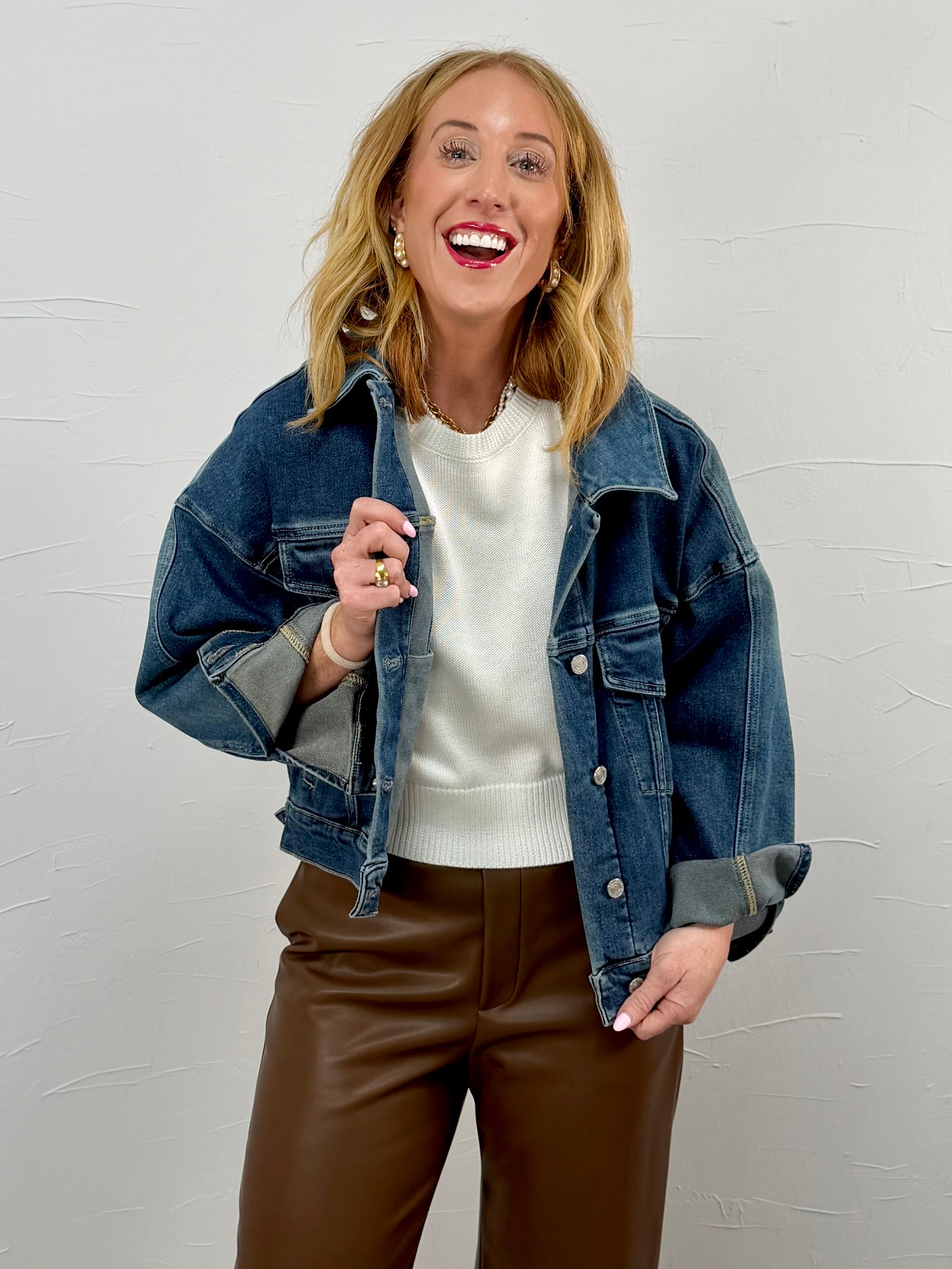 Layer this denim jacket over a cozy knit and leggings for an effortless everyday look, or throw it on with straight-leg denim and boots for a more styled, put-together vibe. It’s the perfect grab-and-go layer that works dressed down for errands or dressed up with accessories for casual dinners.
