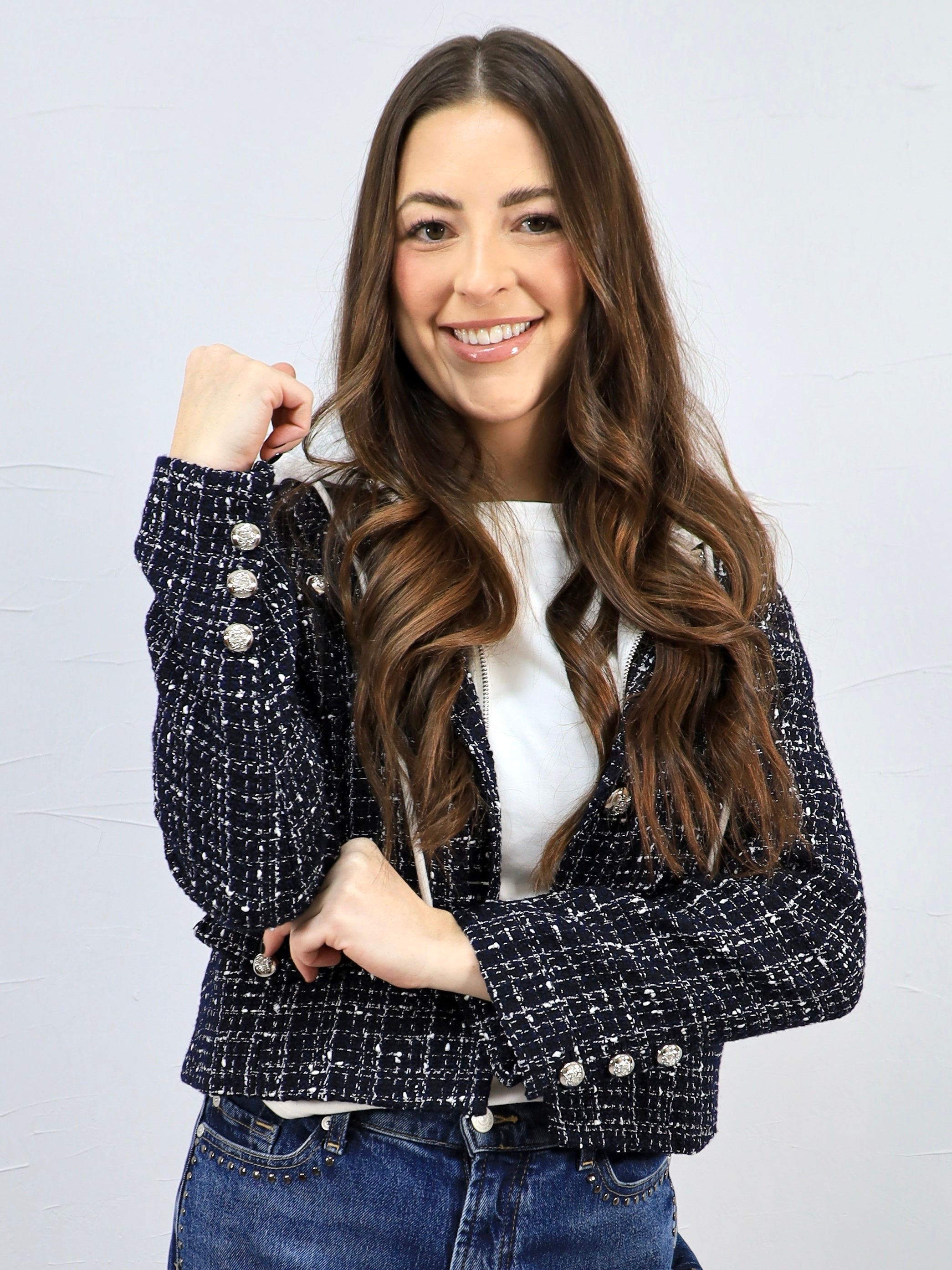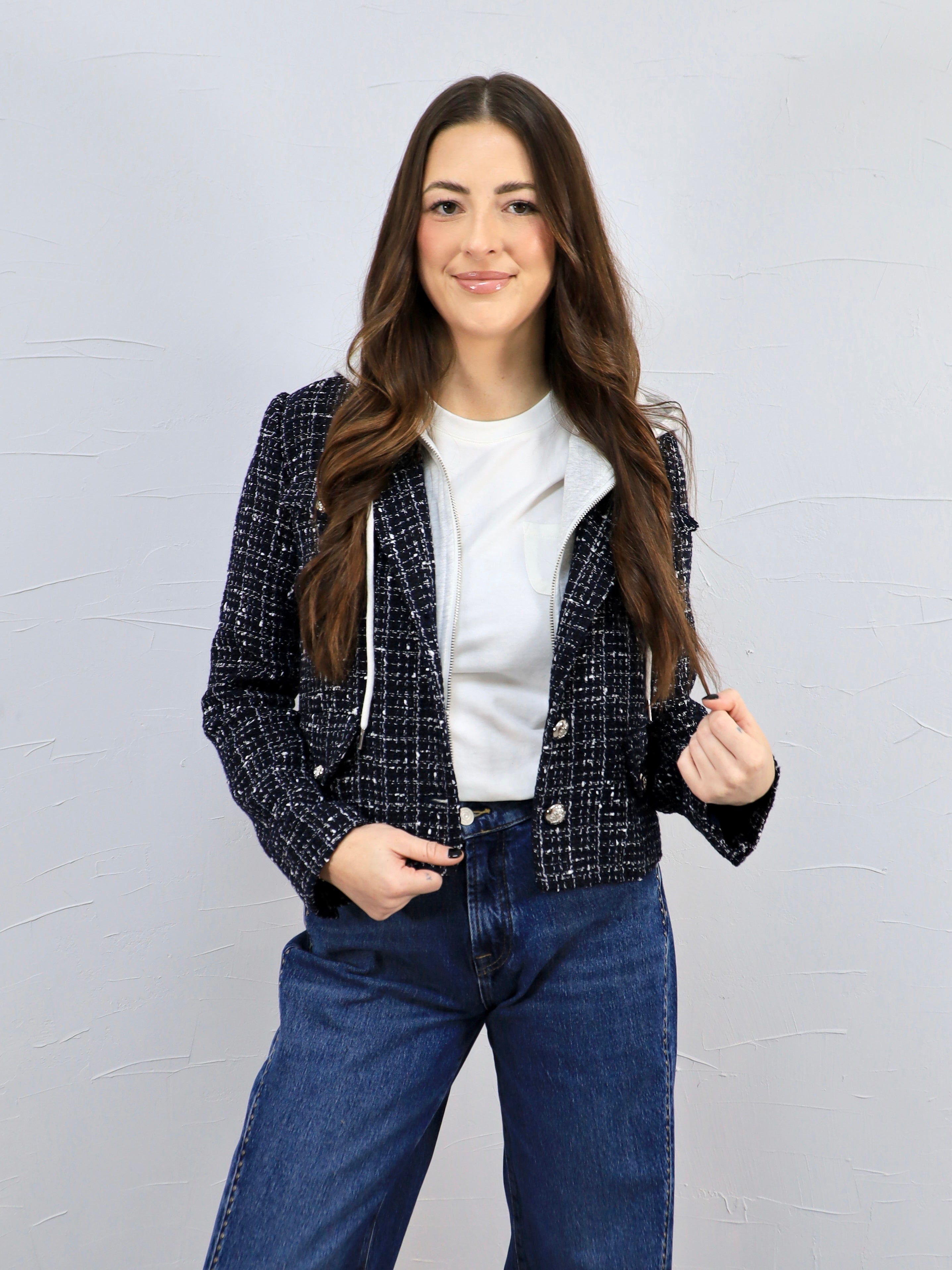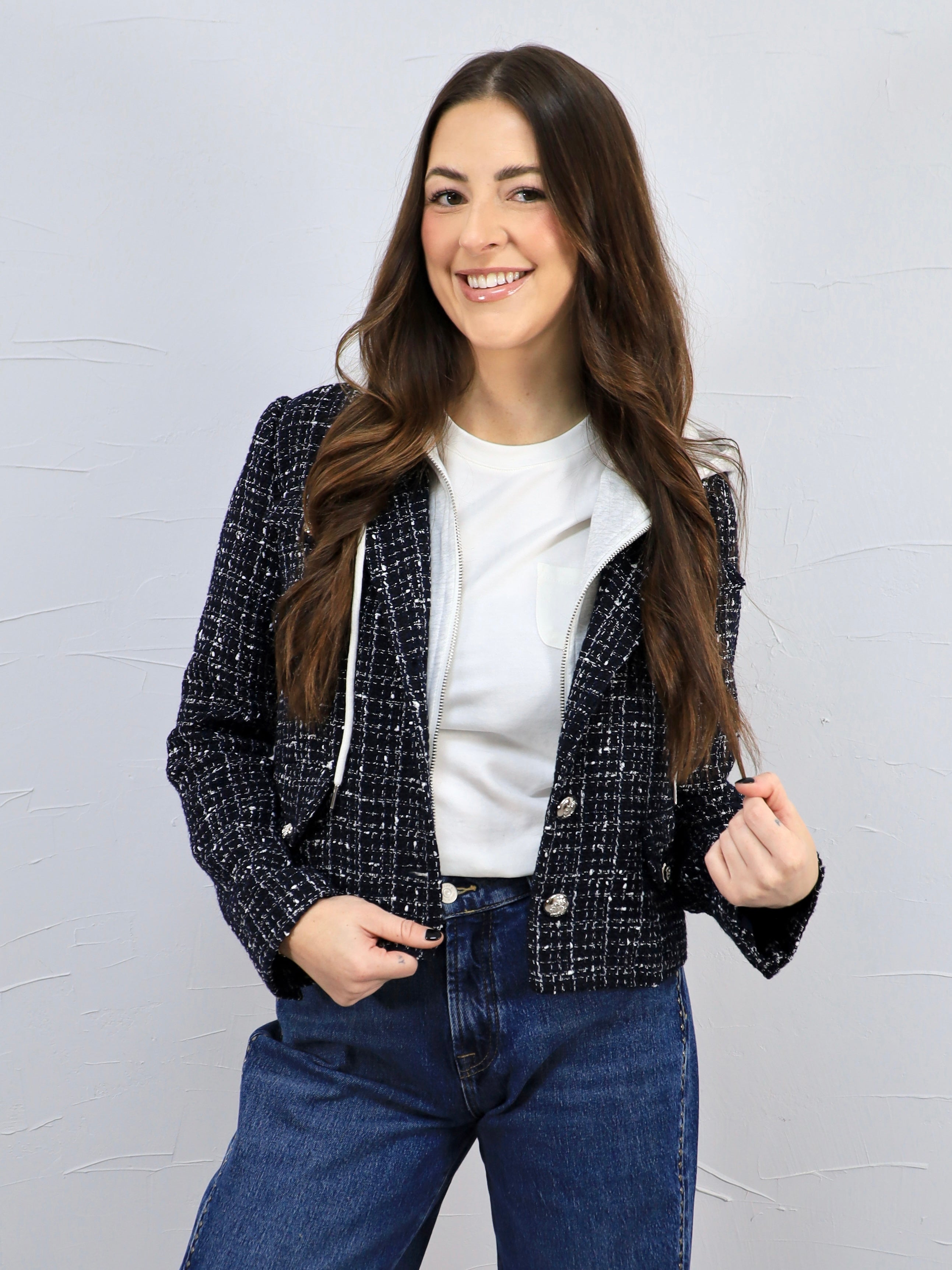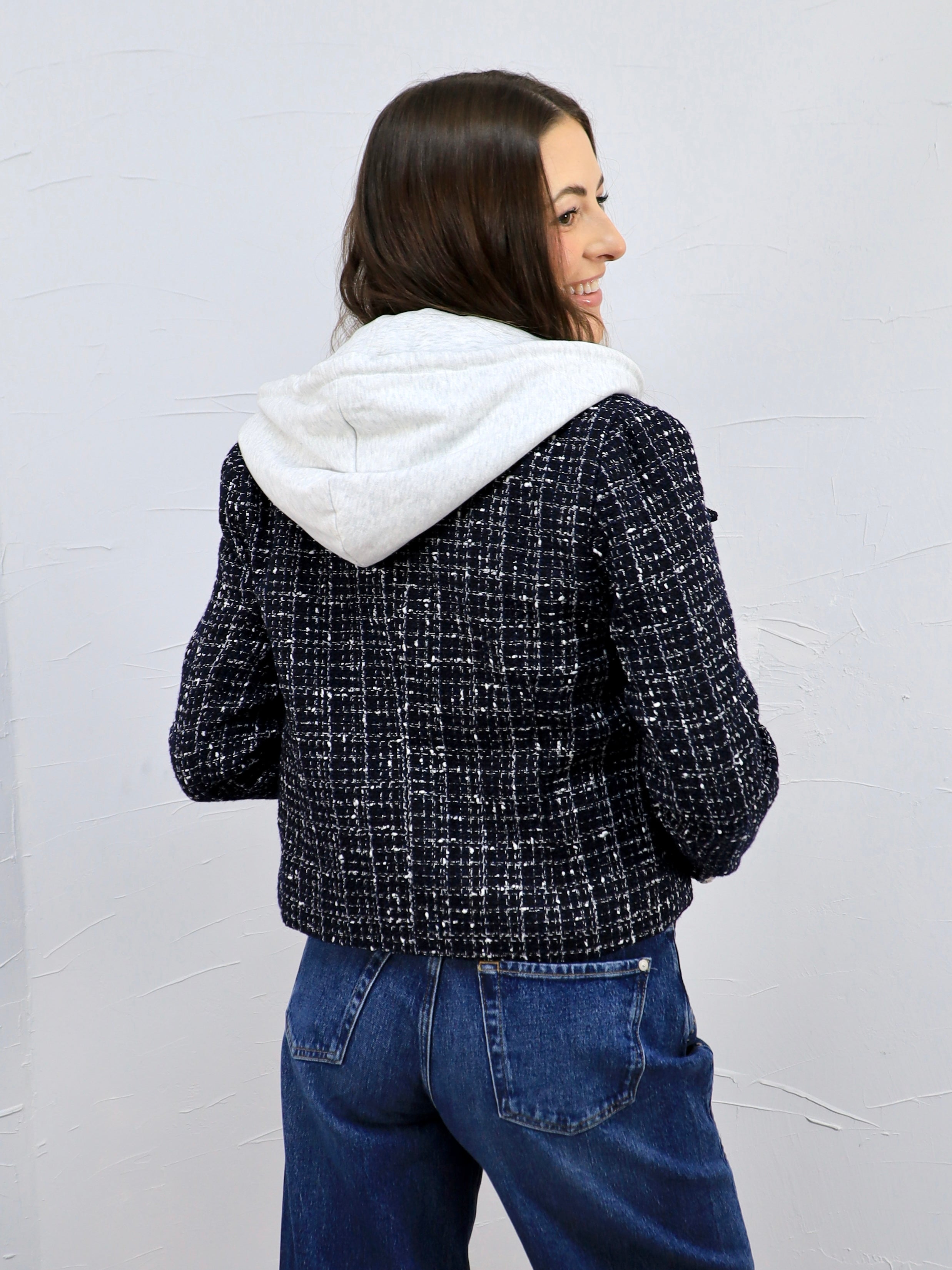 This blue tweed blazer gives you a polished look with a casual twist thanks to the attached gray hoodie for an easy two-for-one style moment. It’s the perfect layer for workdays, casual meetings, or elevating denim while still feeling comfortable and effortless.