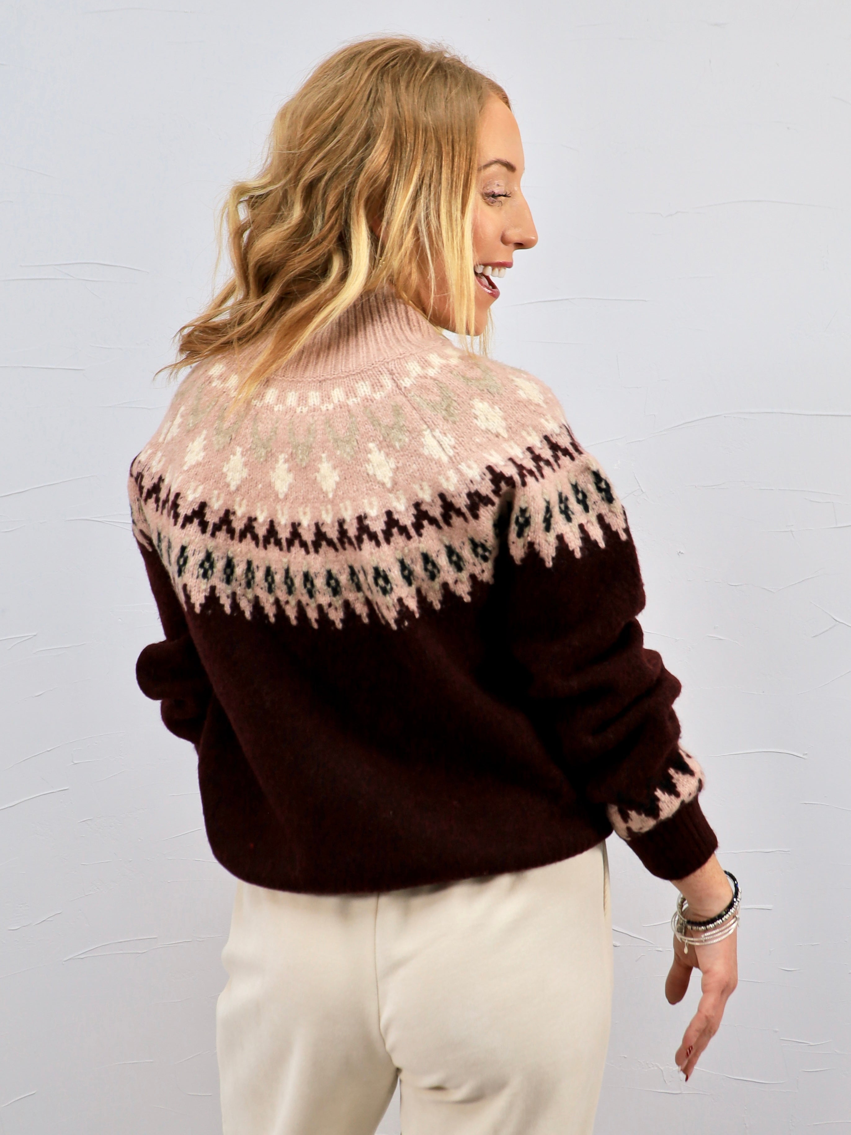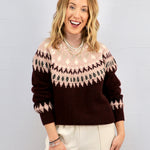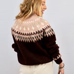 This cozy knit sweater brings all the warm, vintage-inspired vibes with its rich color palette and classic fair isle pattern. It’s perfect for chilly days when you want something comfortable yet elevated, whether you’re heading to the office, brunch, or a casual night out.