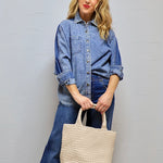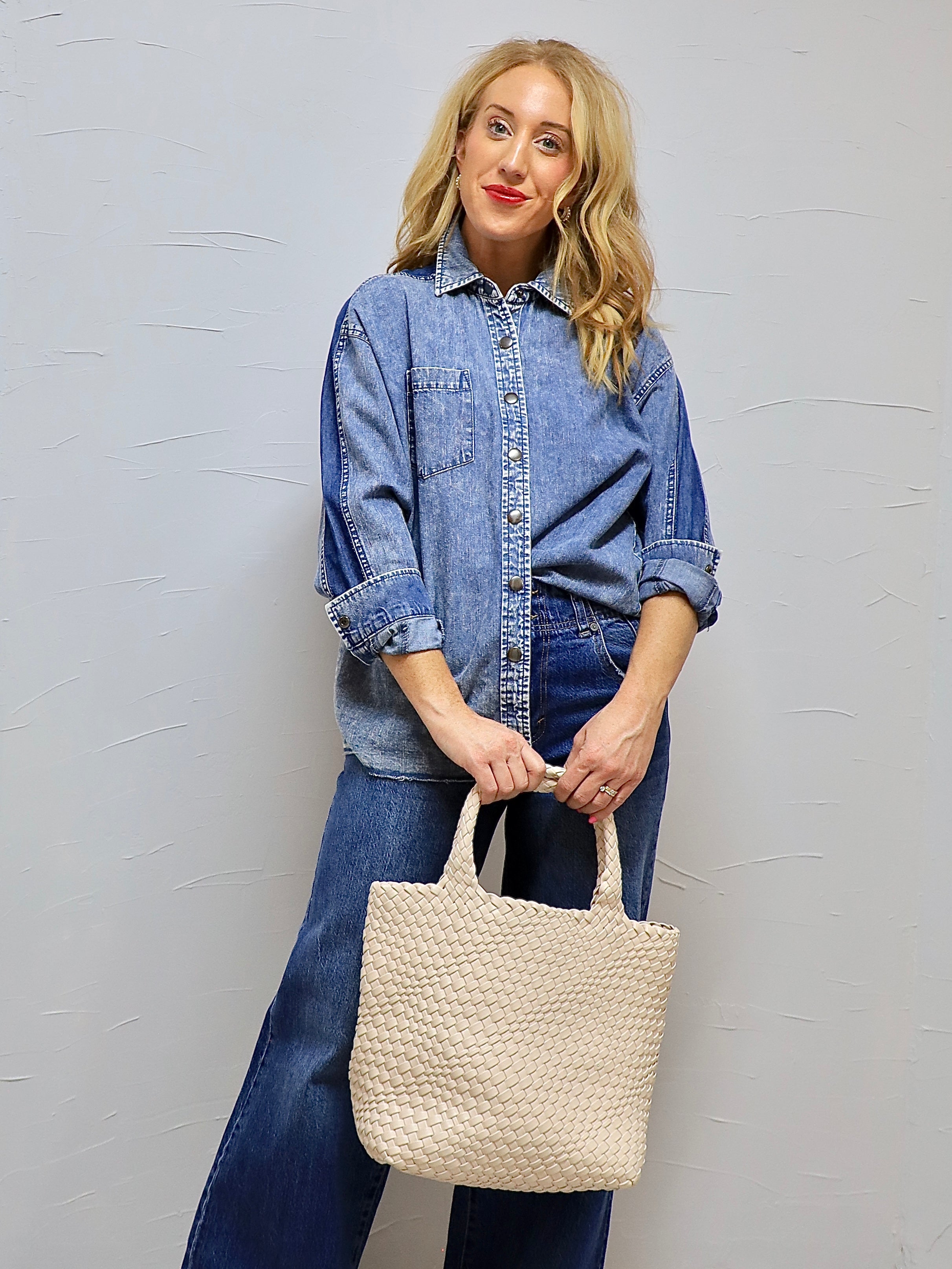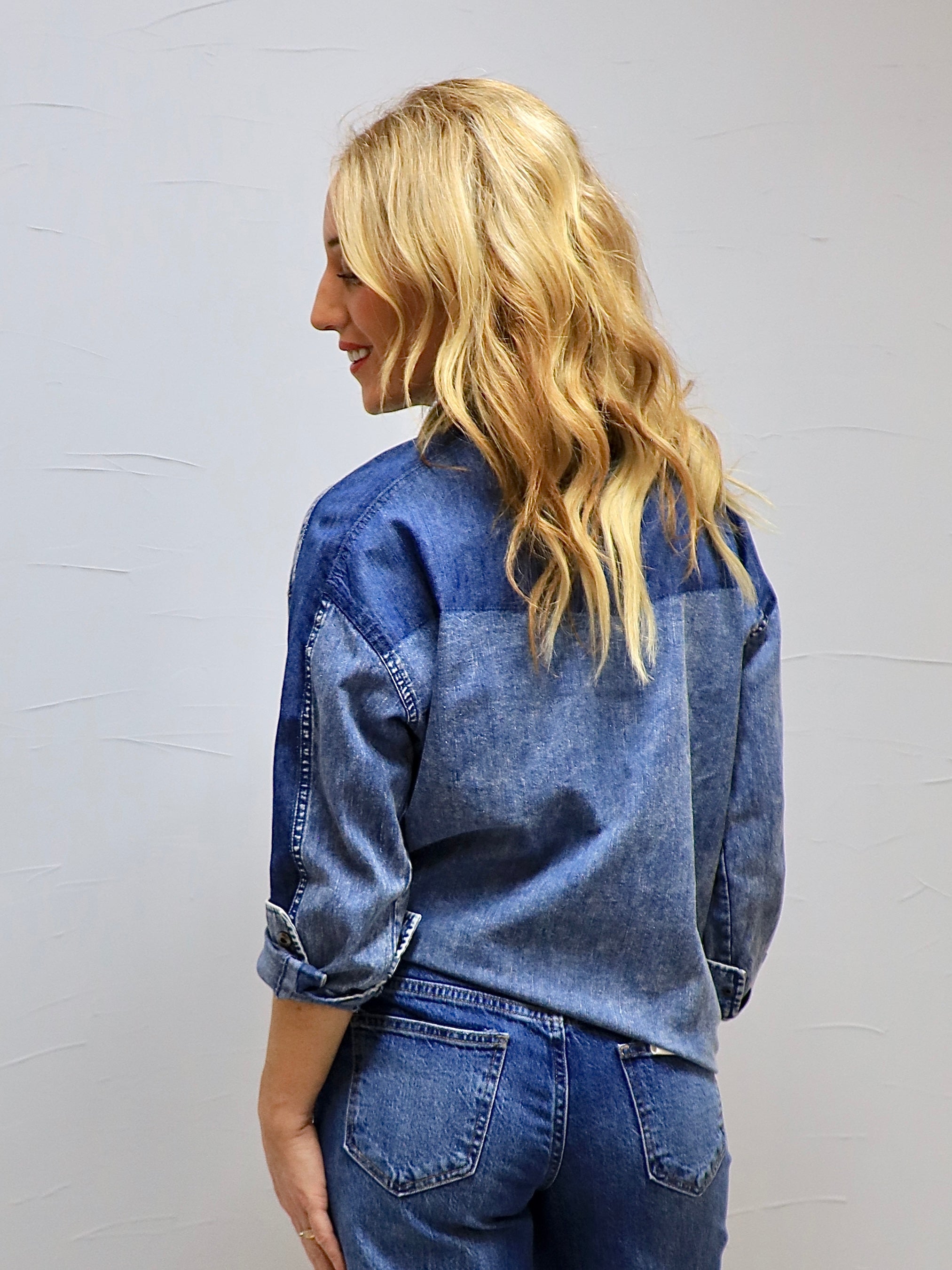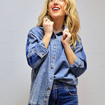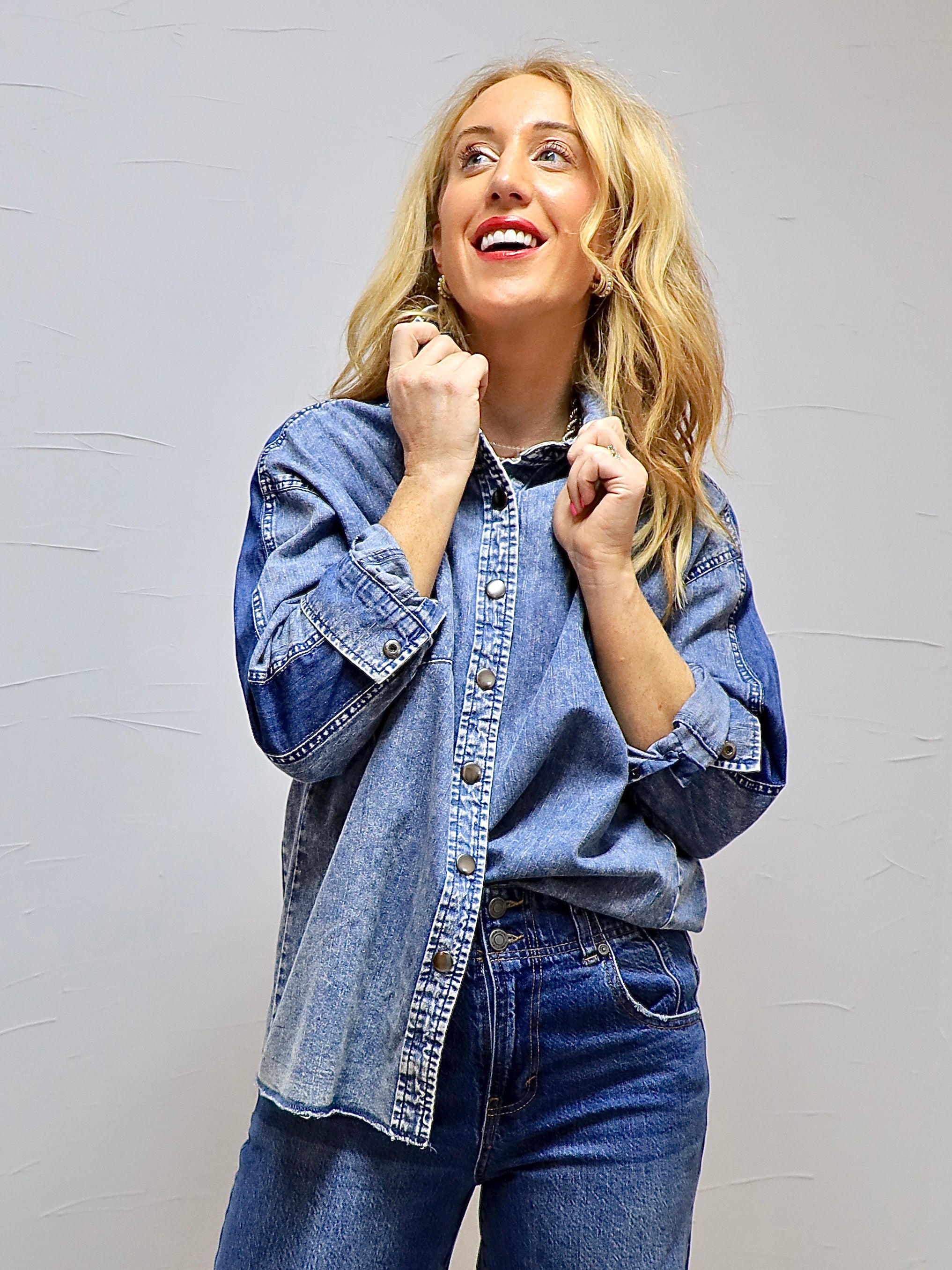 Celebrate the cool weather with a timeless denim button down! Pair it with your go-to denim for a classic "Canadian tuxedo" vibe, or casually tie it around your waist for those unexpected chilly moments.