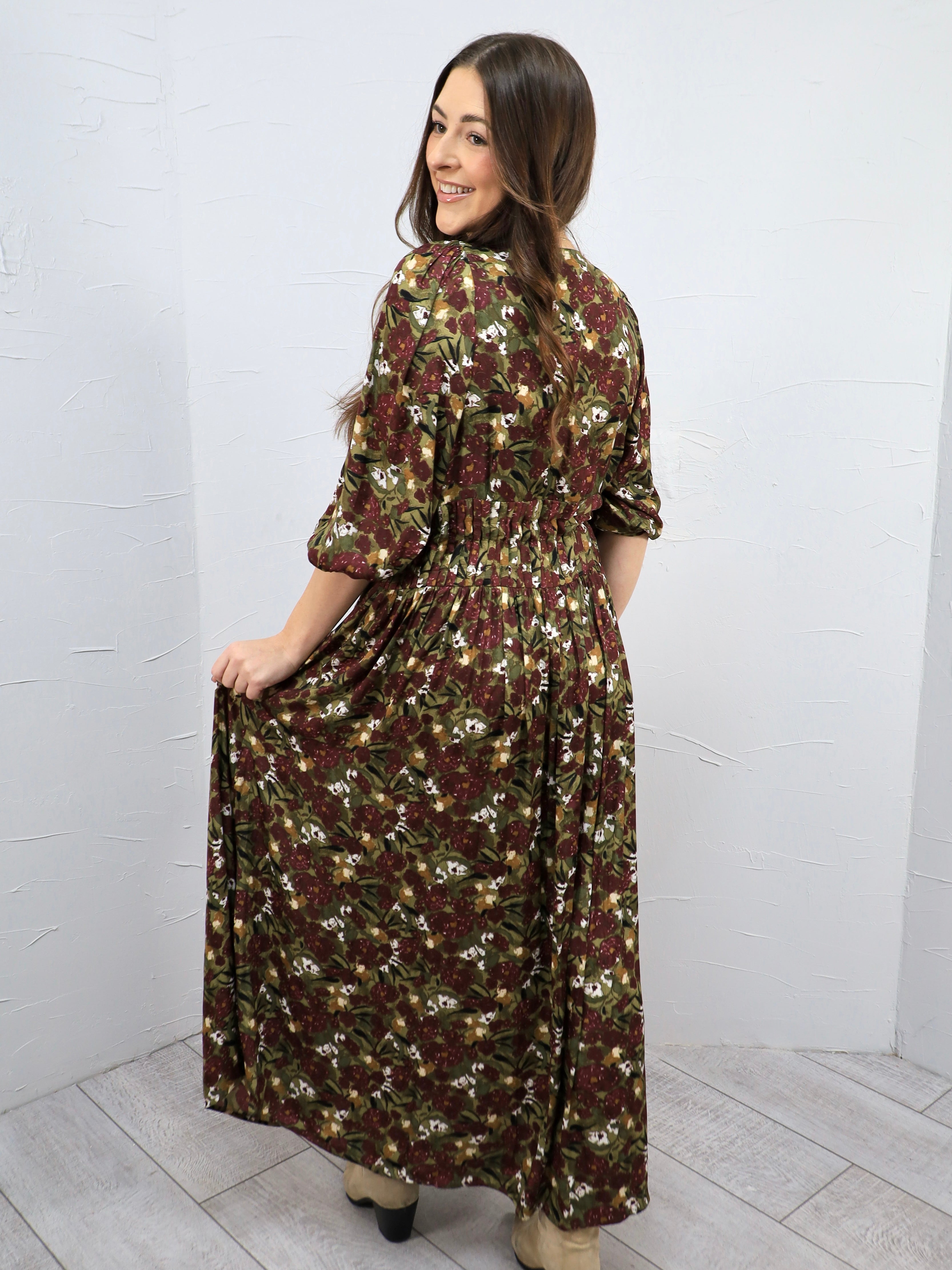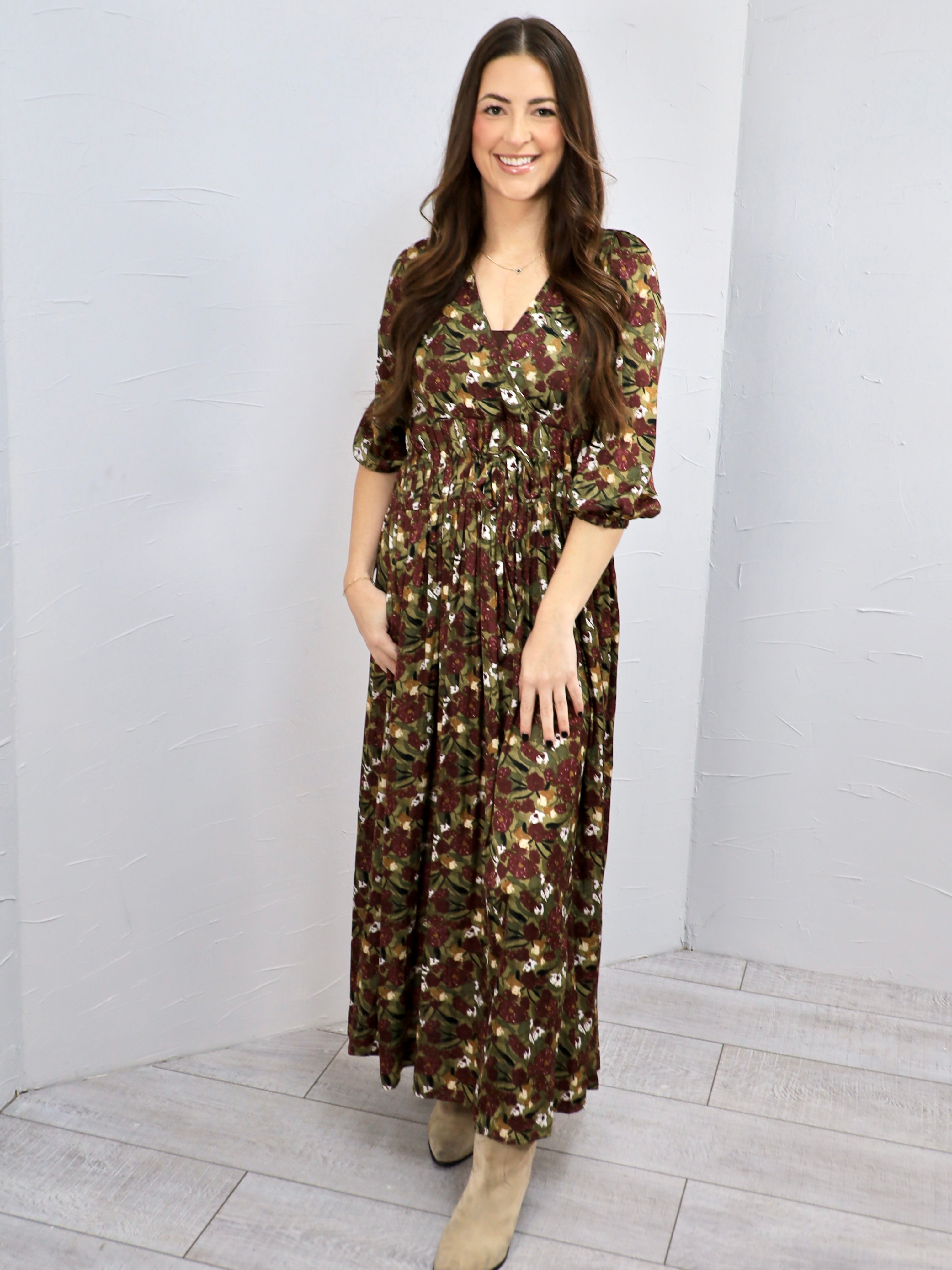 This floral maxi dress is effortless, feminine, and made for those days when you want to feel put together with zero fuss. The flowy silhouette and flattering waist make it perfect for everything from brunch to family photos to casual events.