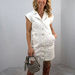 The ultimate concert-ready look, this white denim dress pairs western charm with a touch of edge- just add boots and you're set for the spotlight.