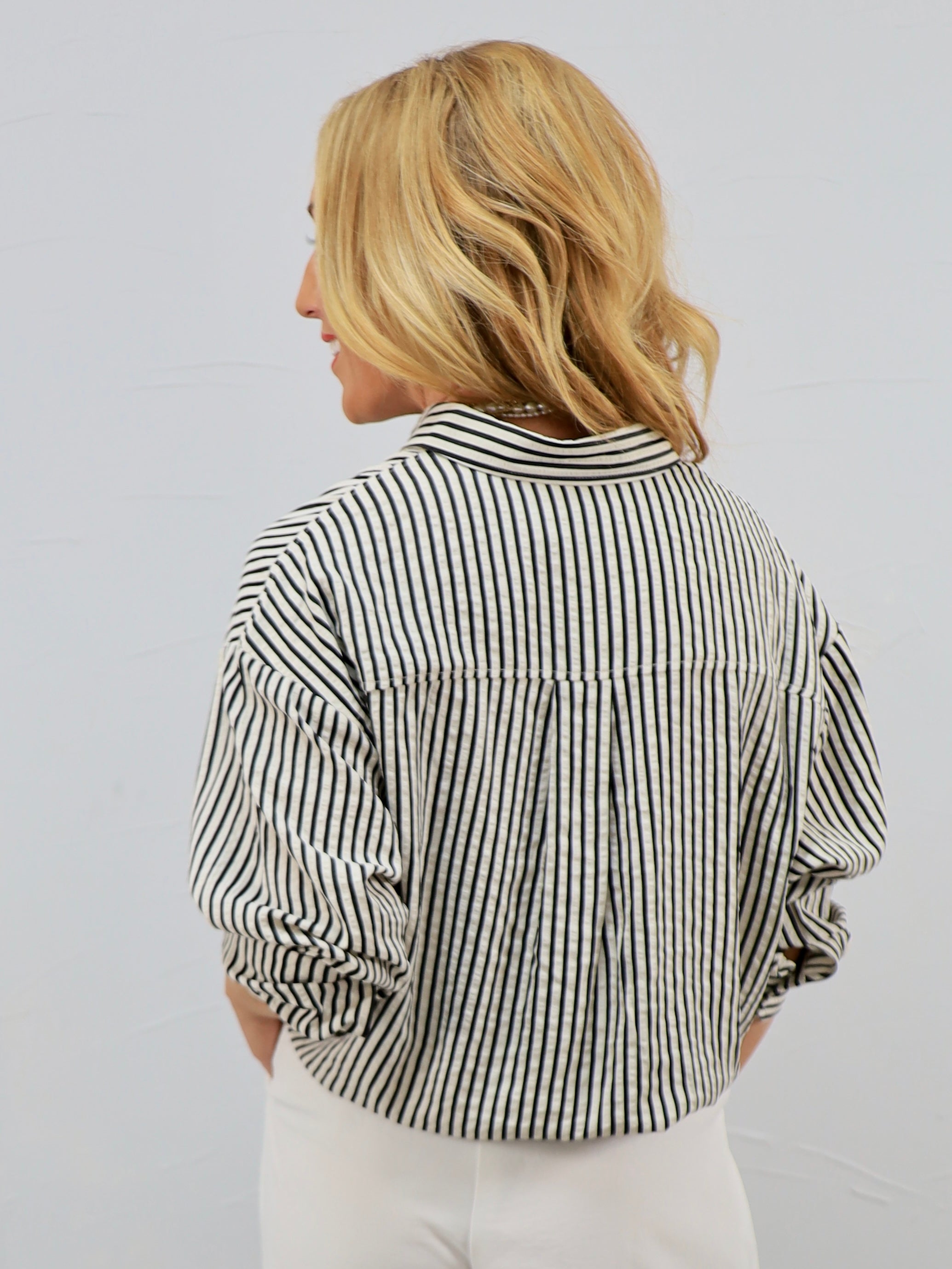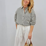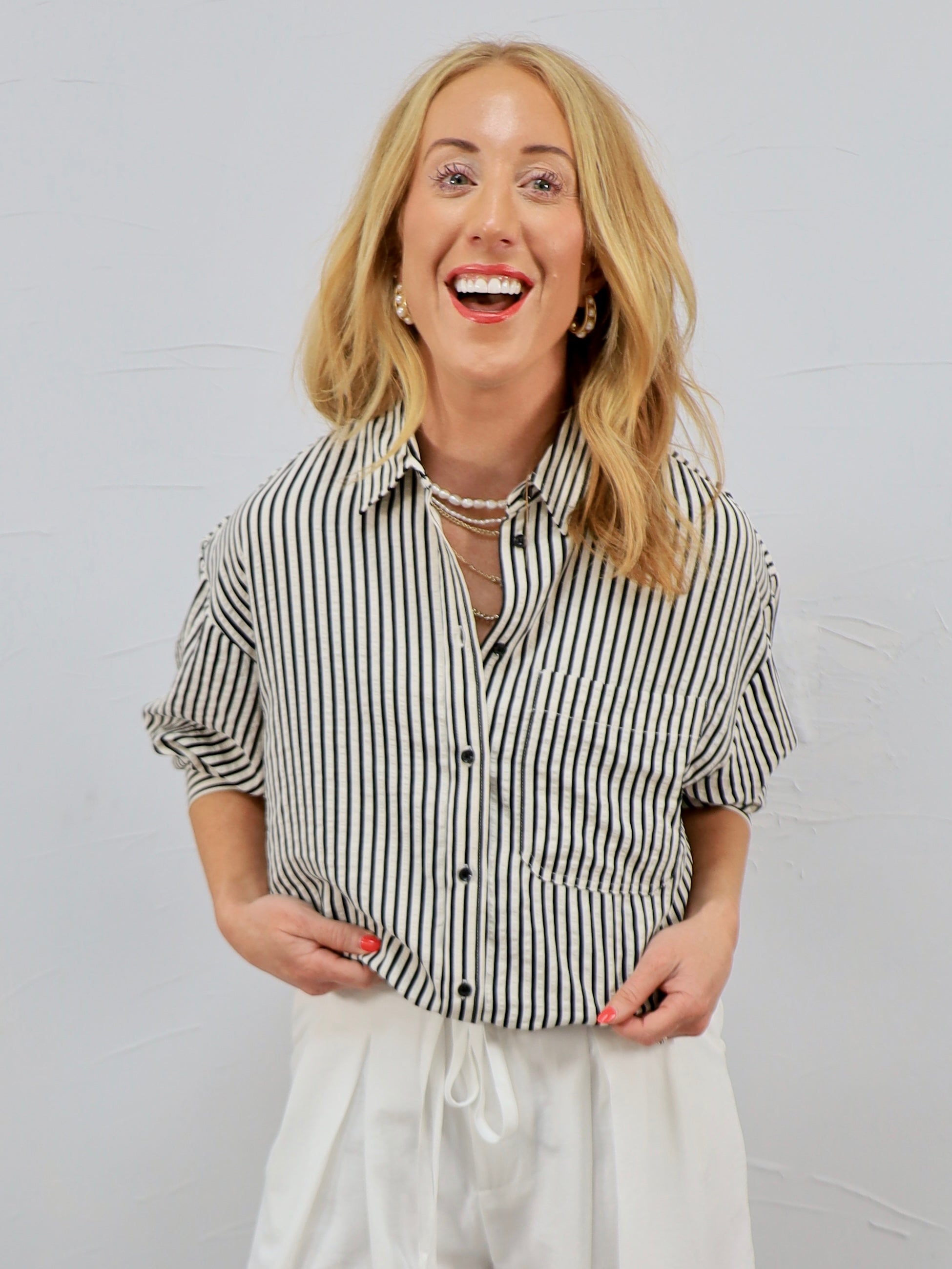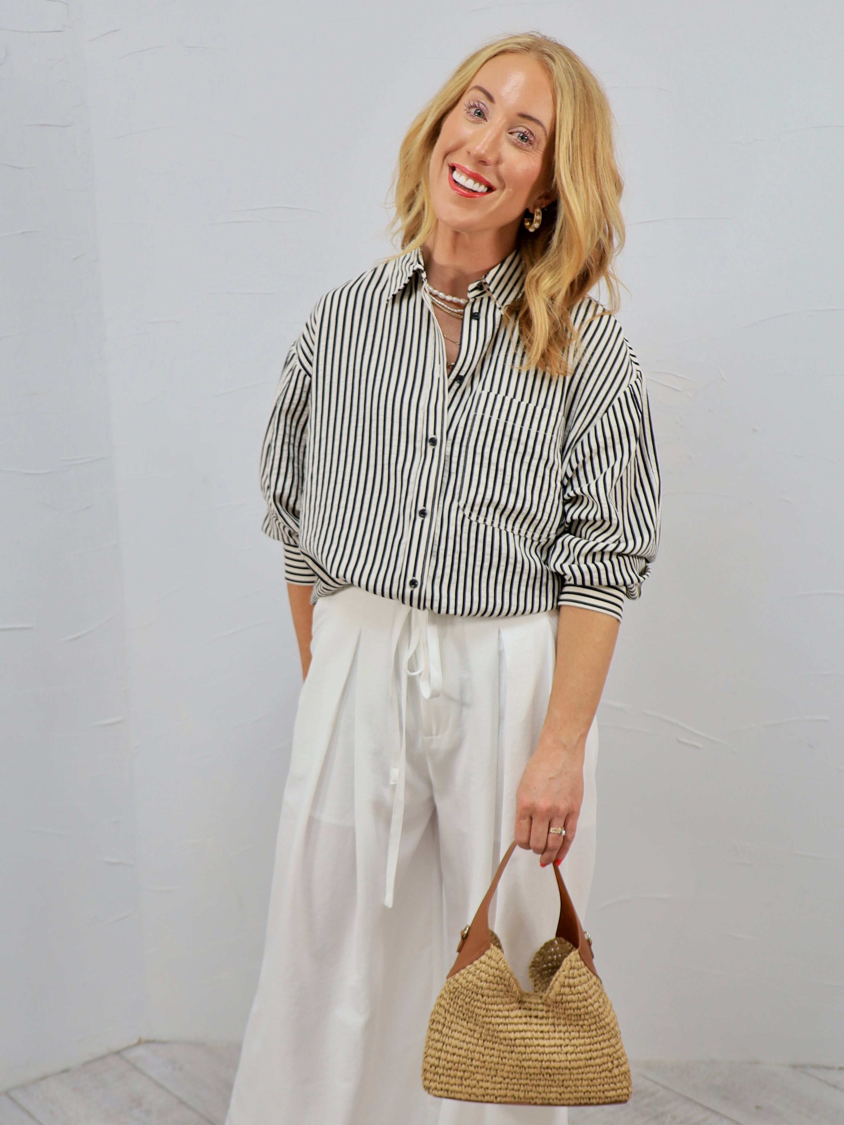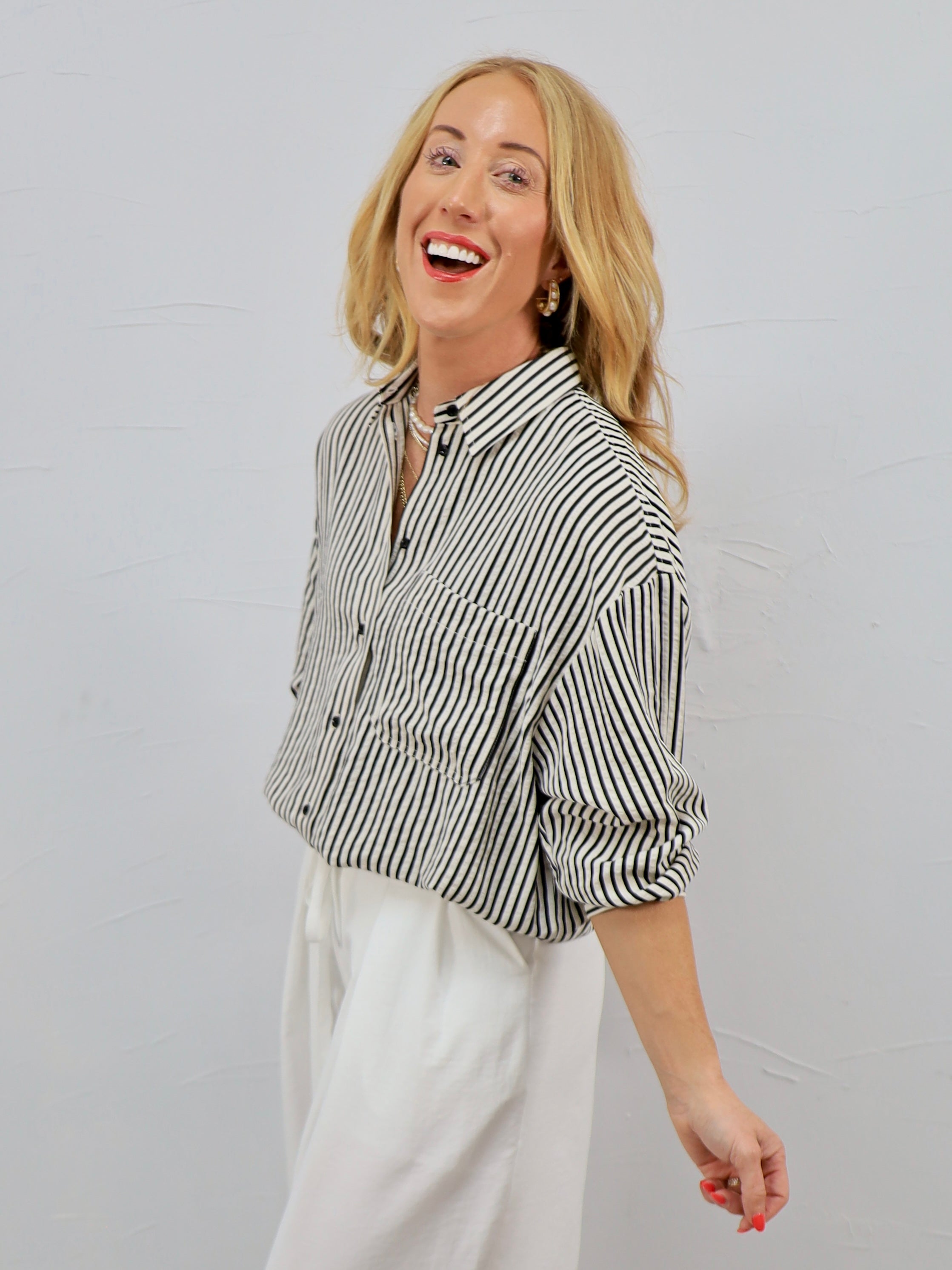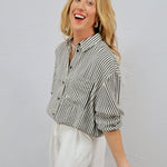 Classic with a modern twist, this striped button-up is the effortless piece your closet will thank you for. It’s perfect for a day at the office or styled casually for brunch, errands, or an easy weekend coffee run.