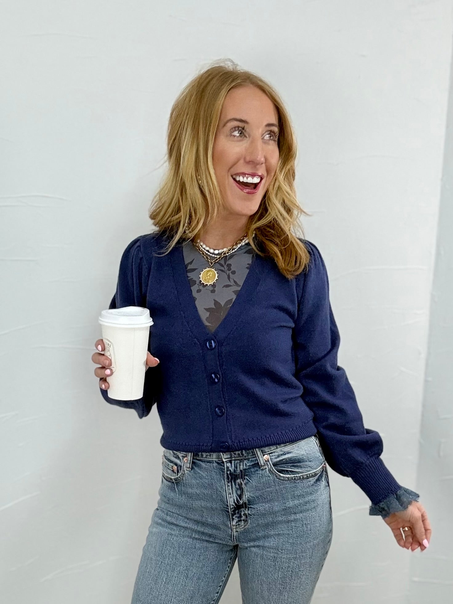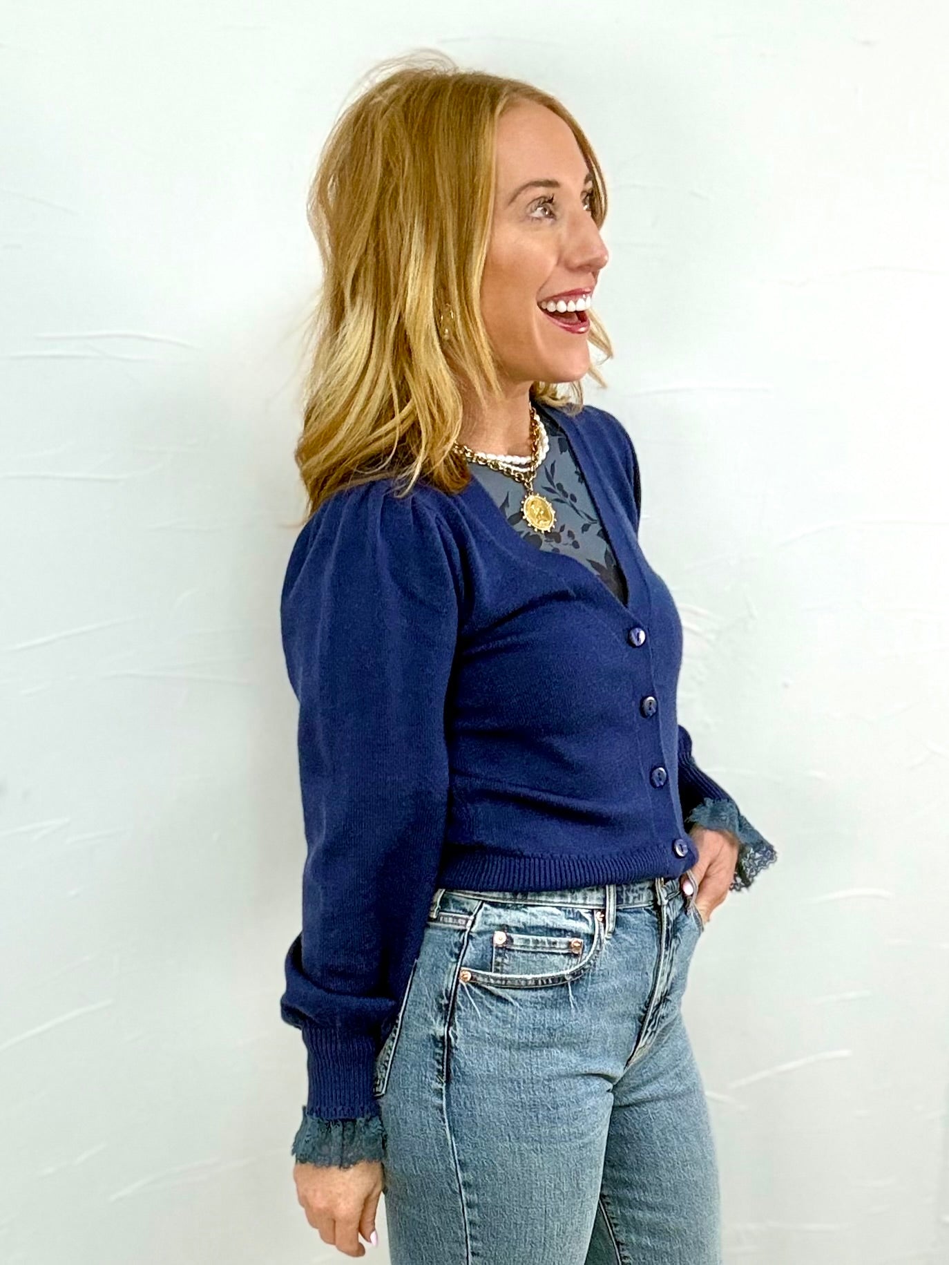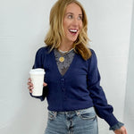 This classic navy cardigan is perfect for layering over your favorite tees or mesh tops for work, church, or casual dinners out. Wear it buttoned up with denim or open over a dress for an effortlessly polished look that still feels cozy.