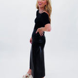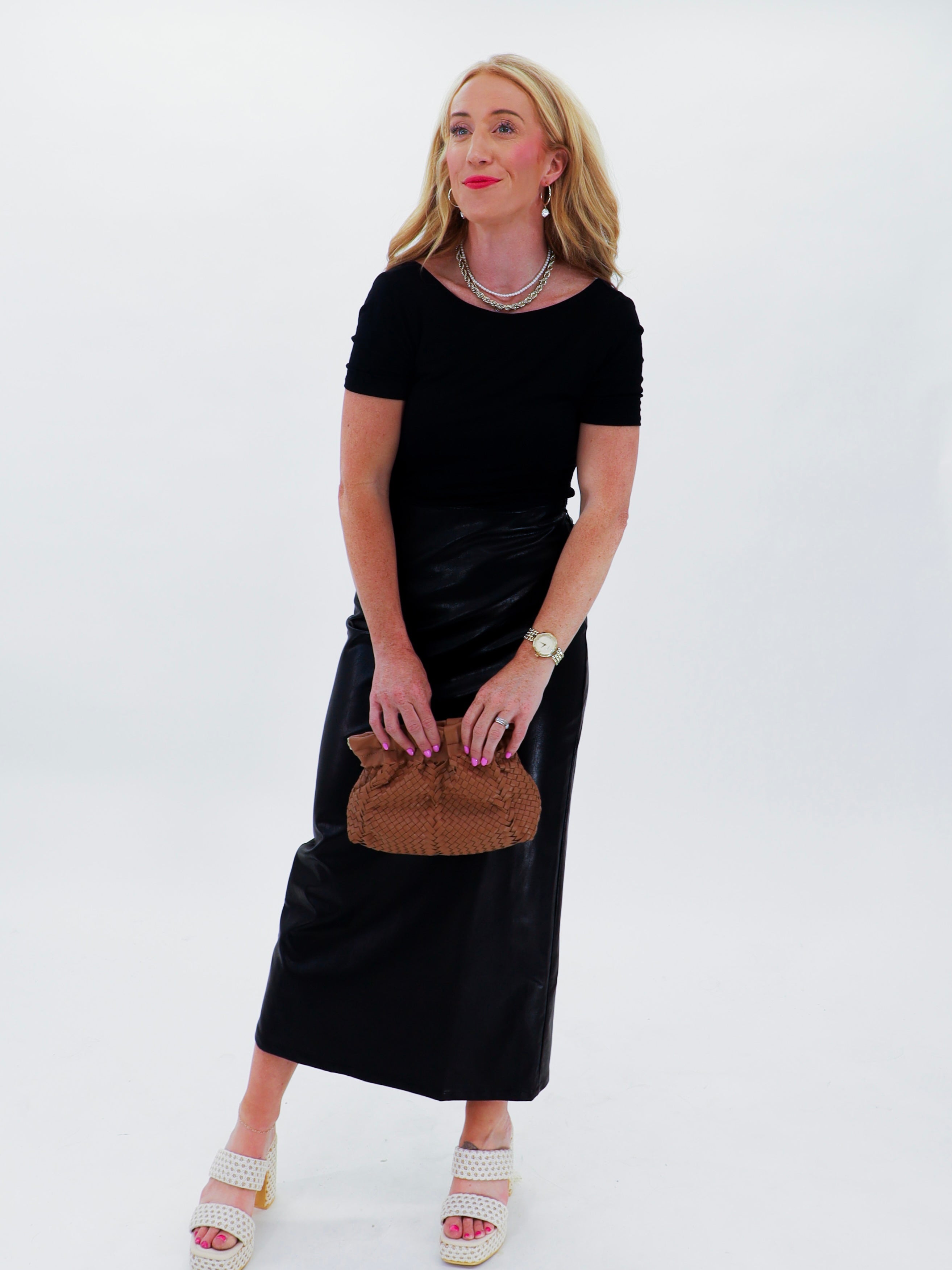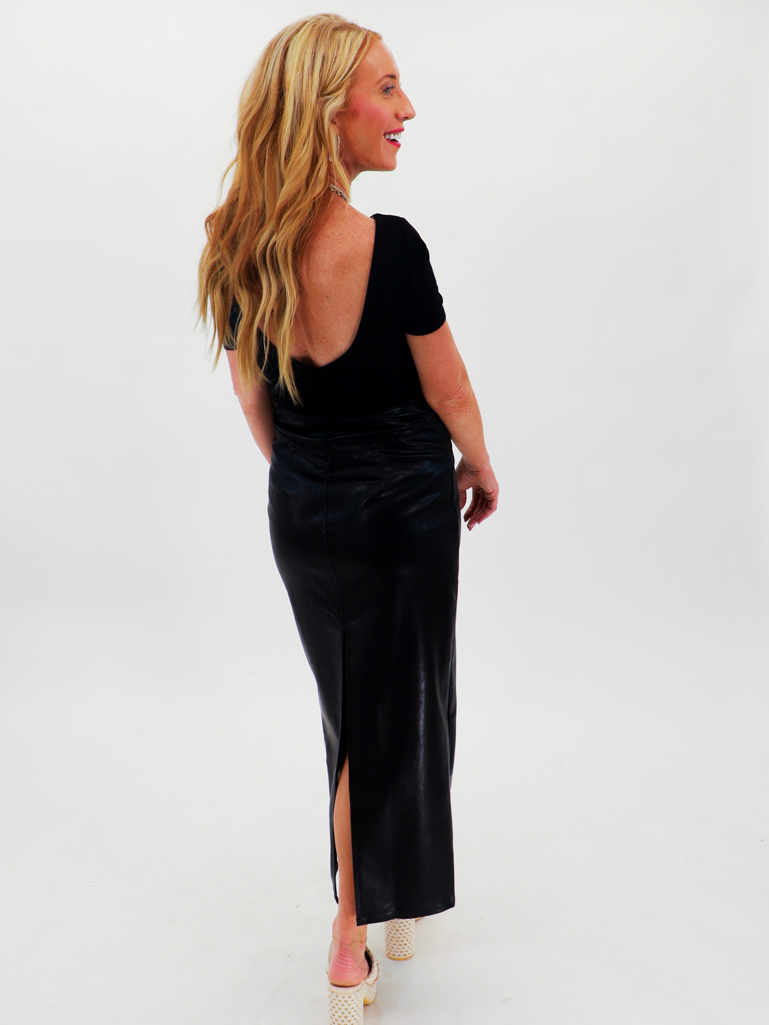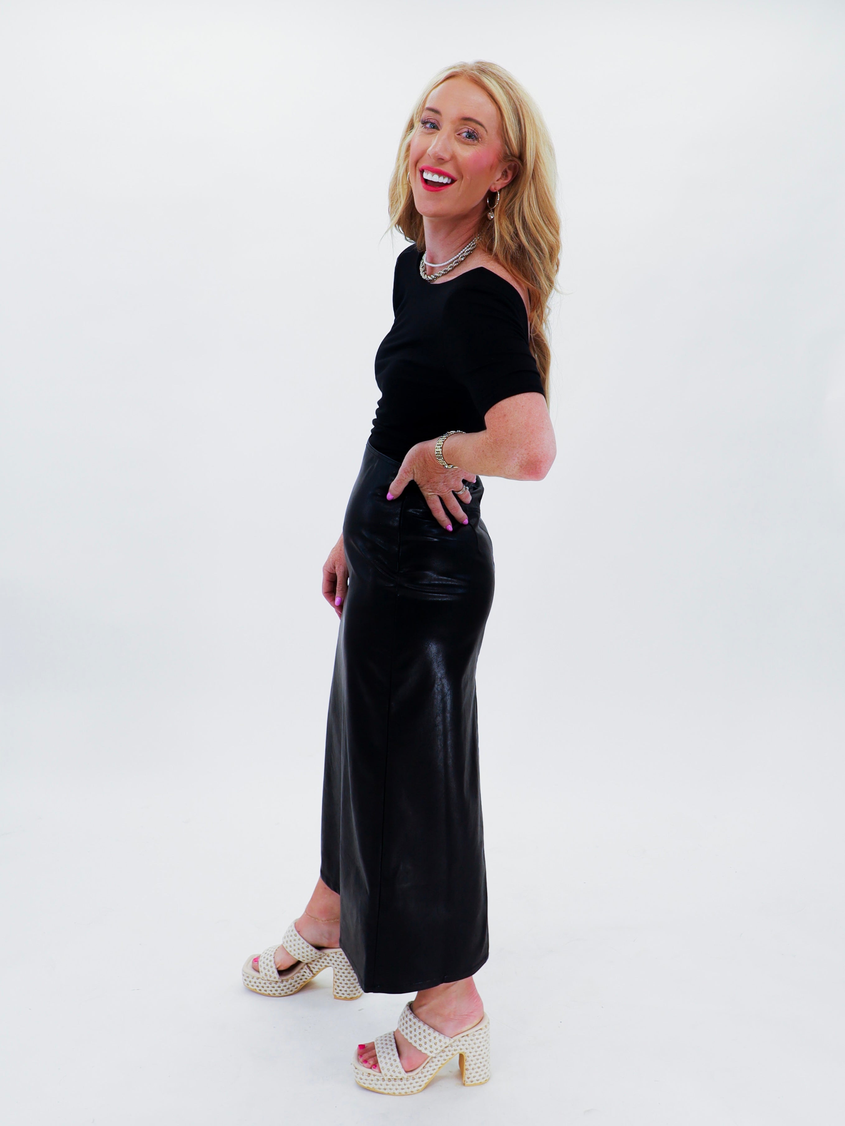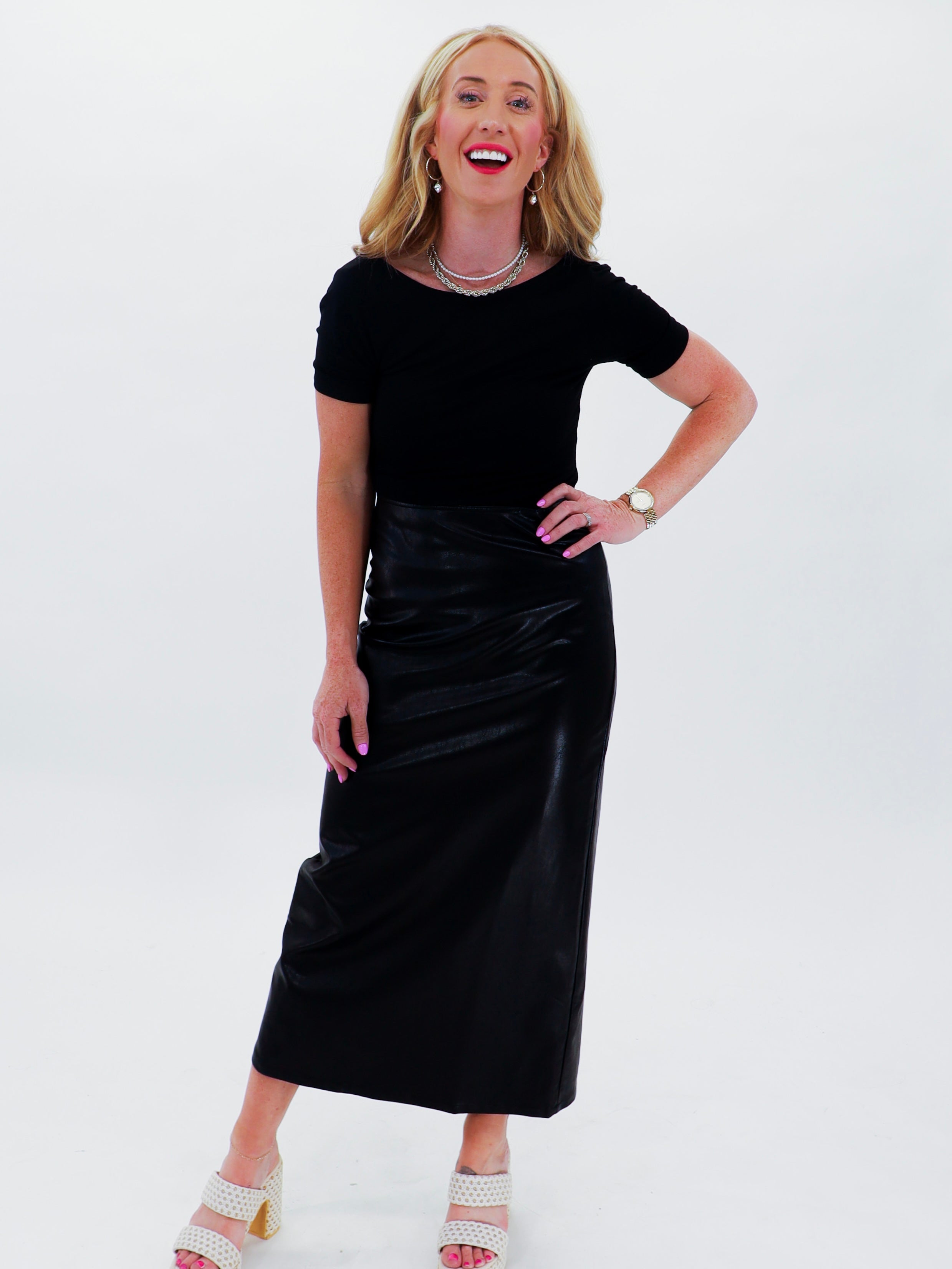 A classic leather skirt that you can dress up or down. Pair this skirt with our Benji's Bodysuit and some cute heels and e ready for a GNO or date night with you sweetie!