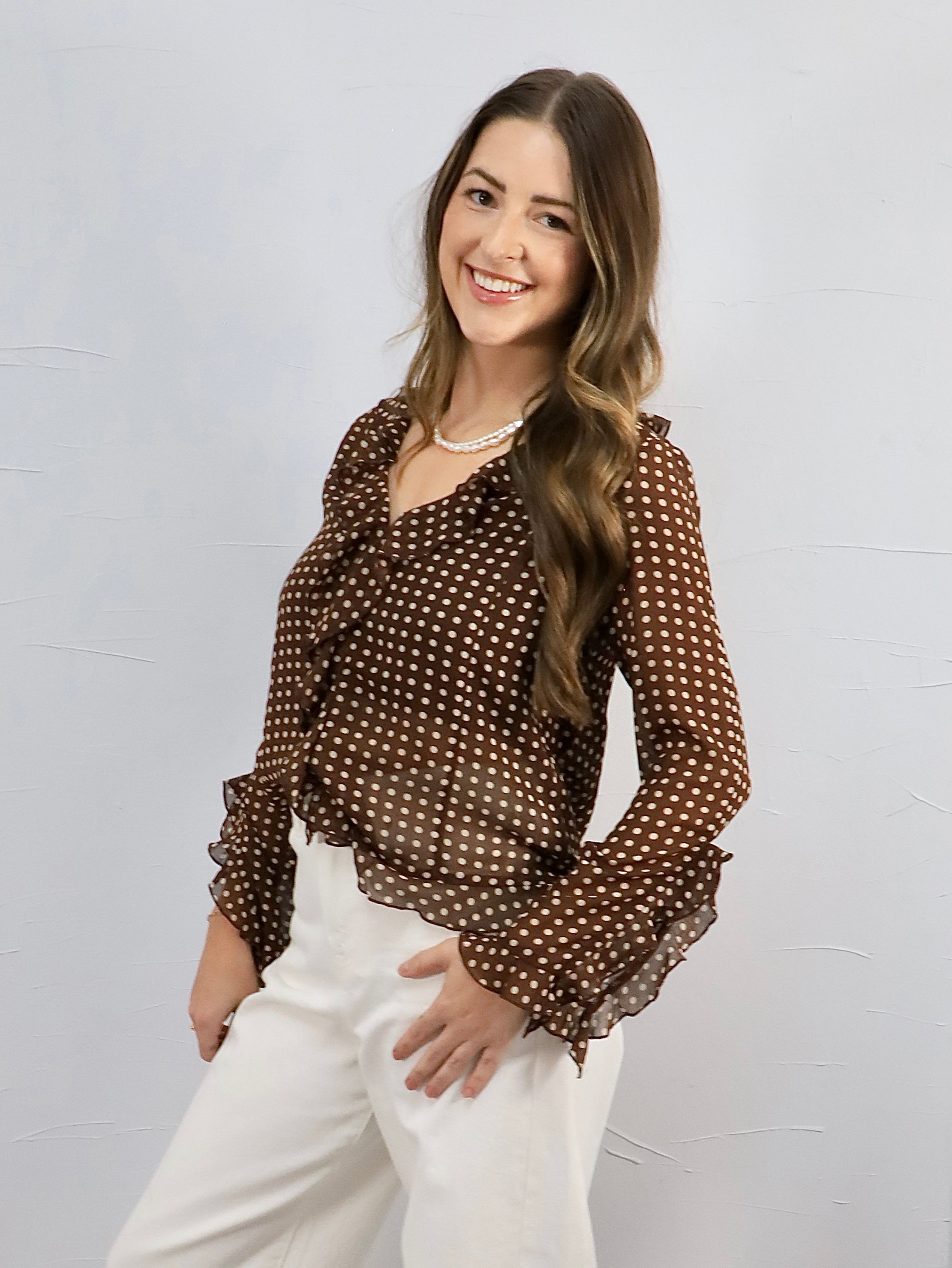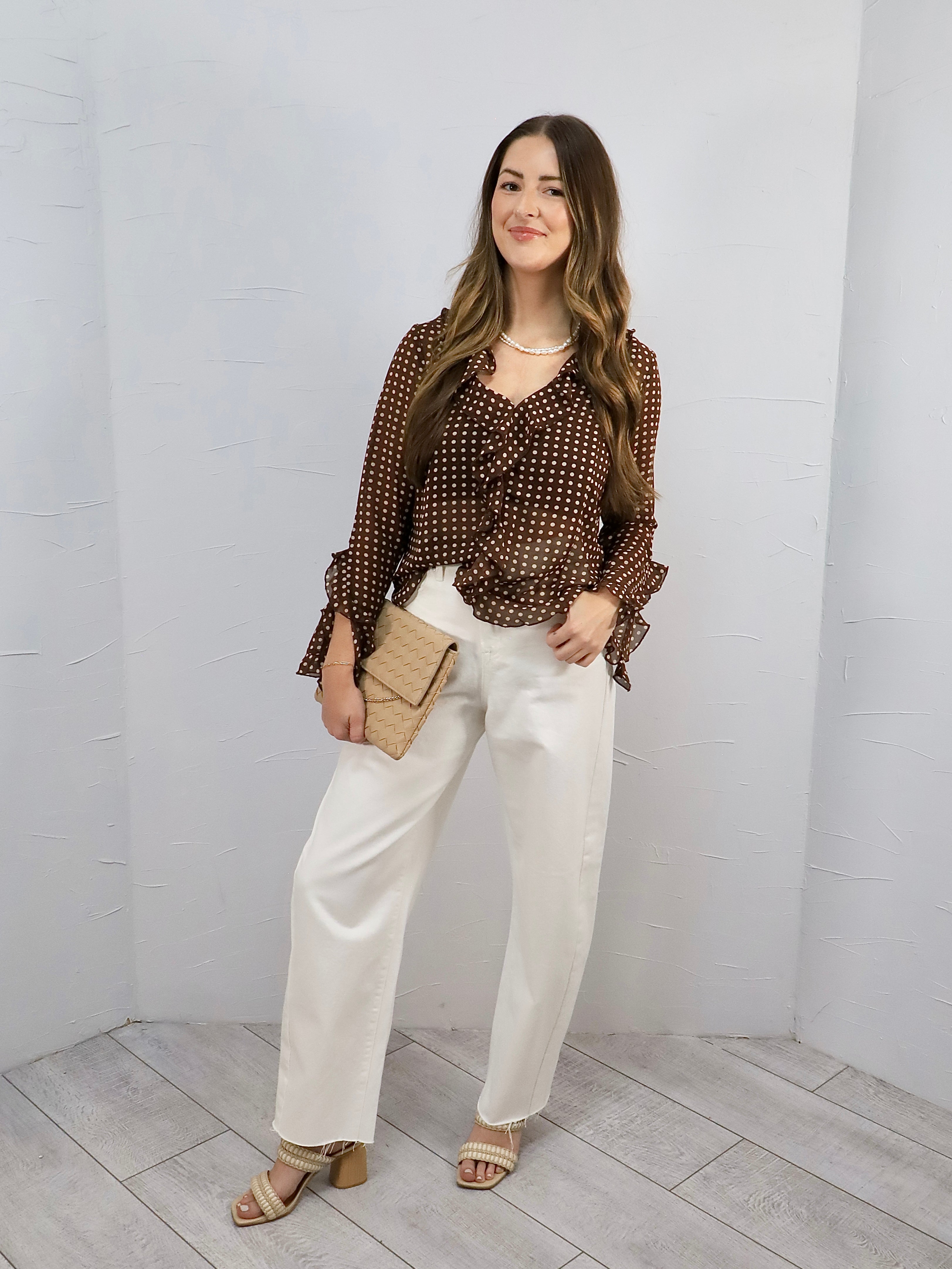 This blouse is soft and chic, perfect for channeling those lovely, feminine vibes. Pair it with our gray pleated skirt for a polished look or go casual with our ivory barrel denim and flats—ideal for a fun lunch date with your besties.