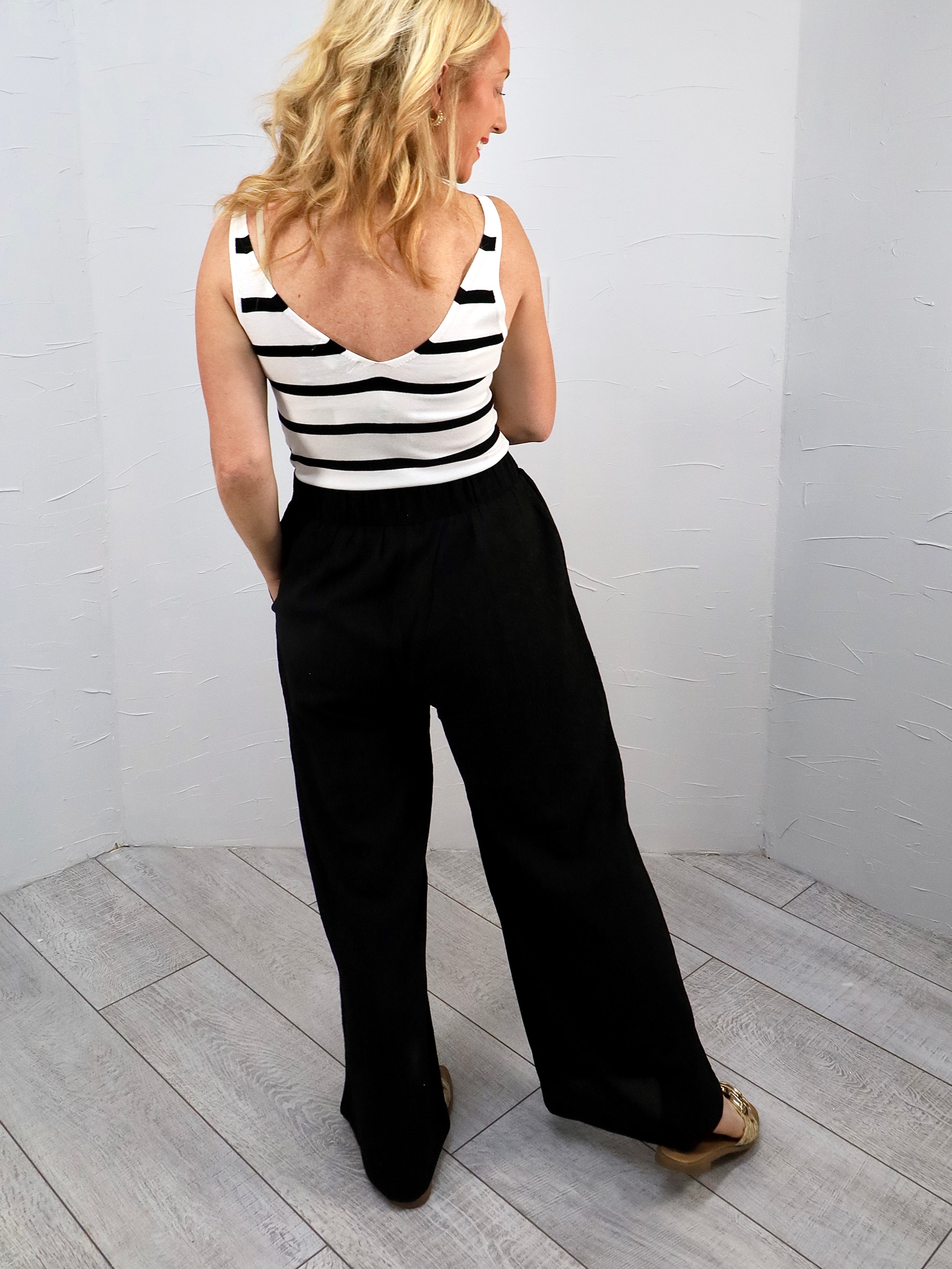 The warmer months are beckoning and these pants are the go-to for your next adventure. Pair with some bright slides and our Sondra's Striped Tank for a quick, effortless look that will have you ready for a surprise coffee date