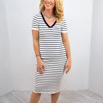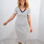 This adorable midi dress is stealing our hearts! Perfect for everything from brunch outings to park playdates and relaxed lake adventures. Rock it with Converse for a casual vibe, or elevate your look with ballet flats and a draped cardigan when meeting your special someone for coffee. Molly's Nautical Dress is the versatile piece your wardrobe has been craving!