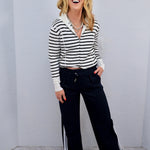 Our Get Cozy Striped Zip Up is the perfect comfy day top. Pair it with leggings or sweats to be your coziest. Imagine a rainy day in cuddled up with your warm mug watching your comfort show.