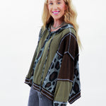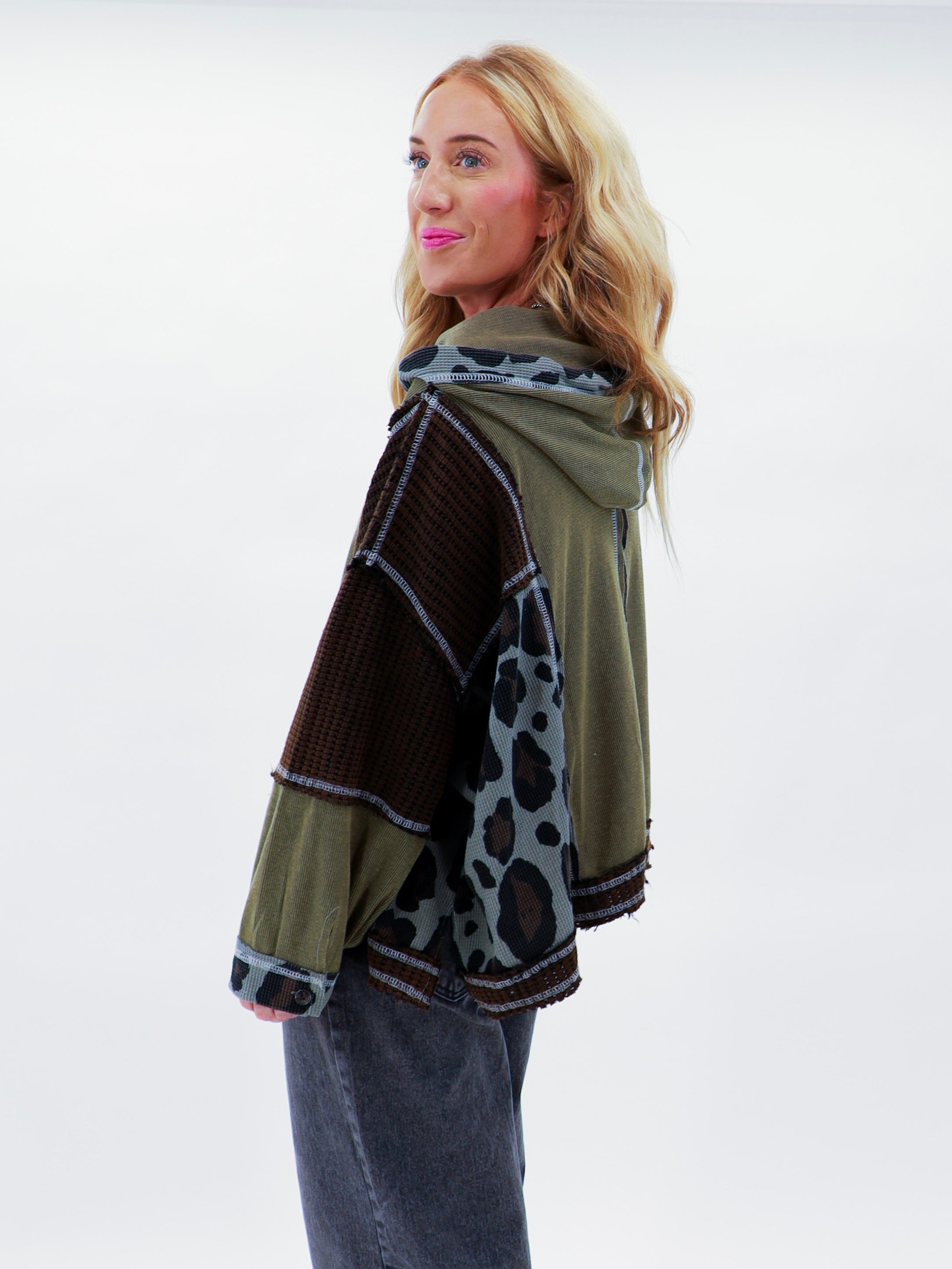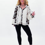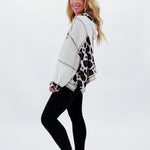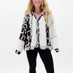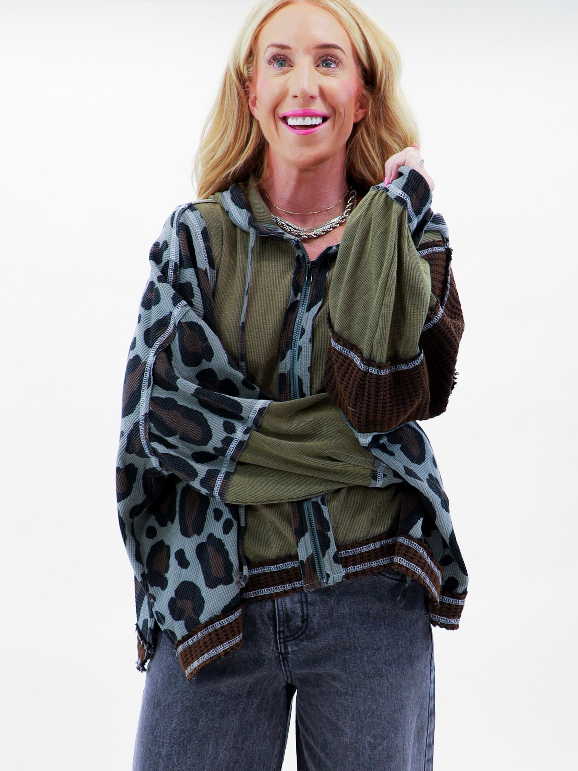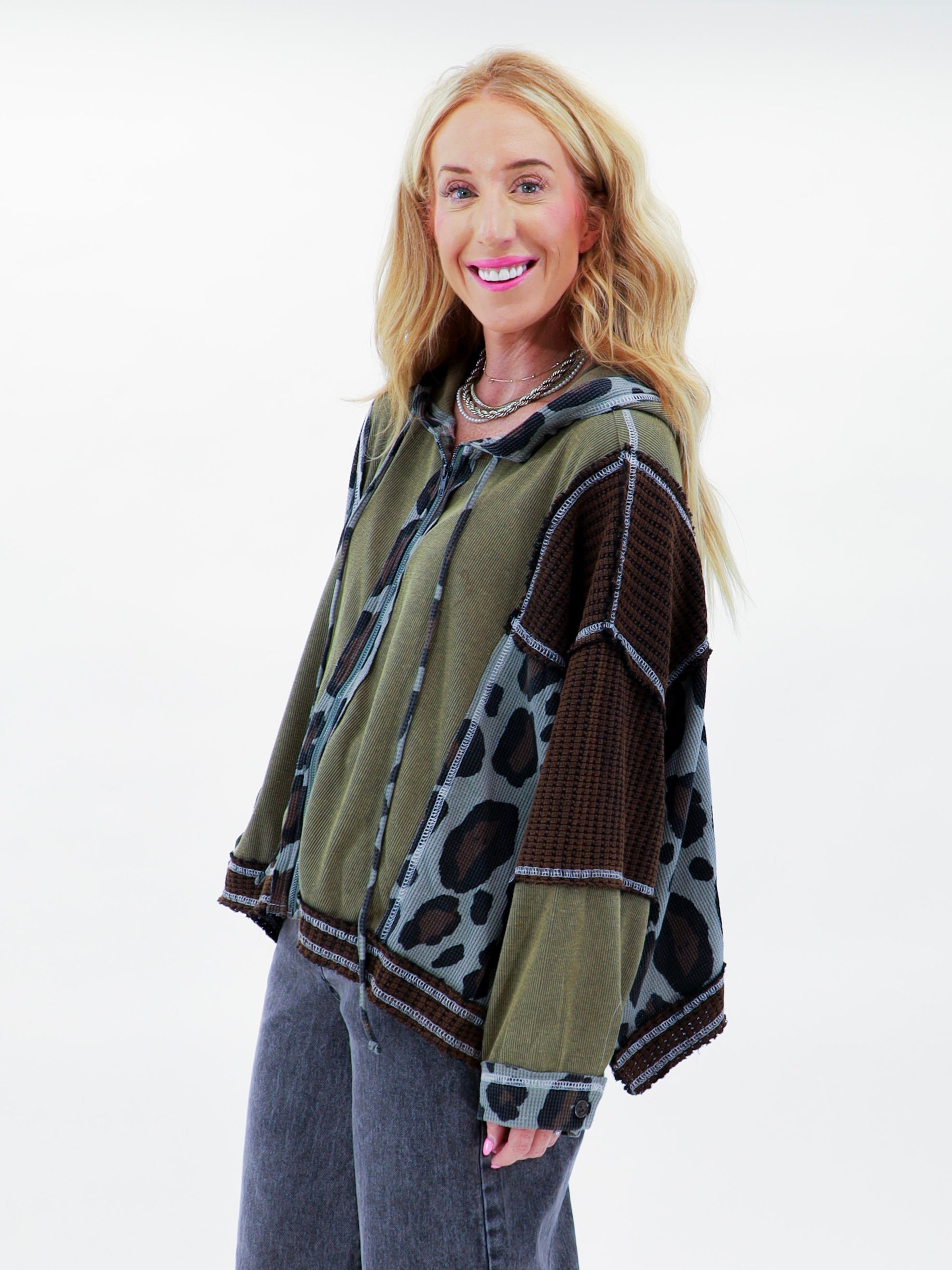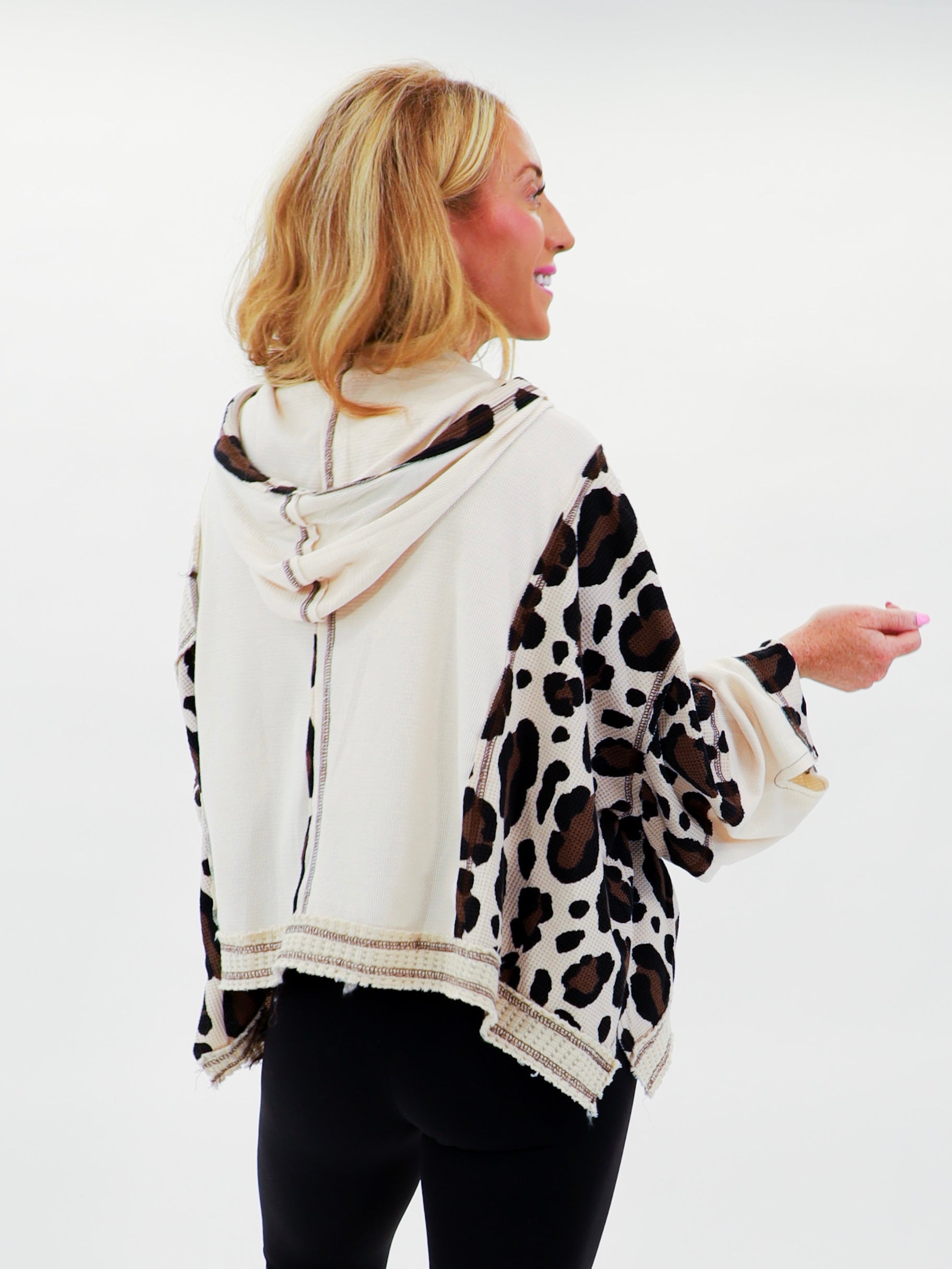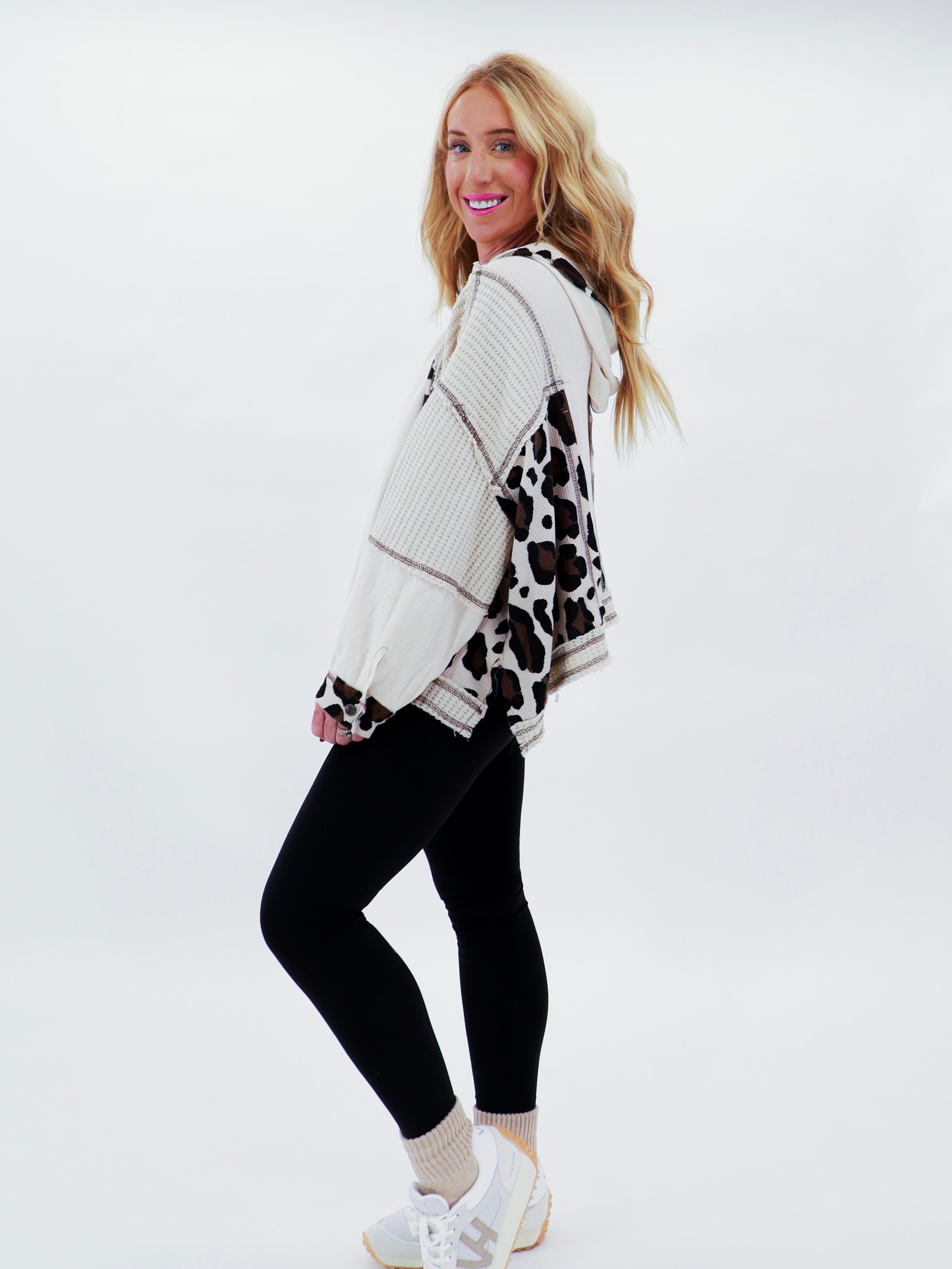 A zippie, thats’s leopard, has a hood and pockets- what more do we need to say! Pair with legging for a morning adventure, or denim to dress it up all while being cozy.