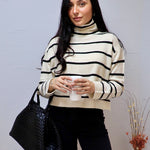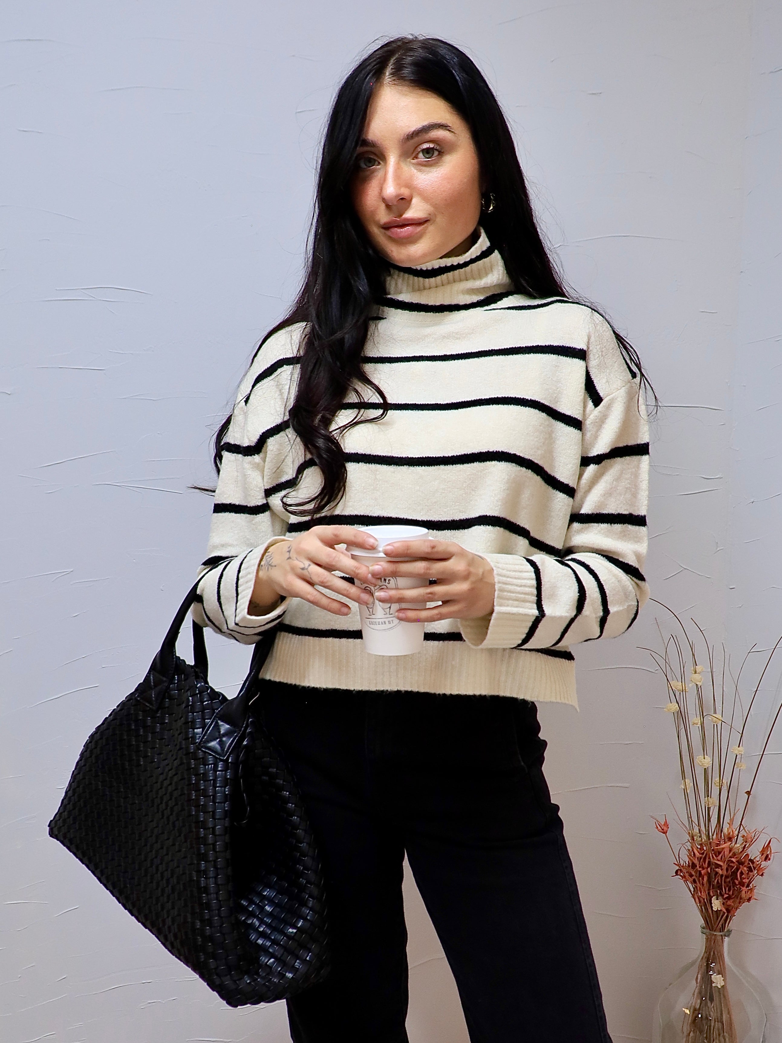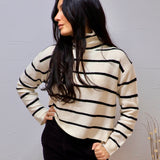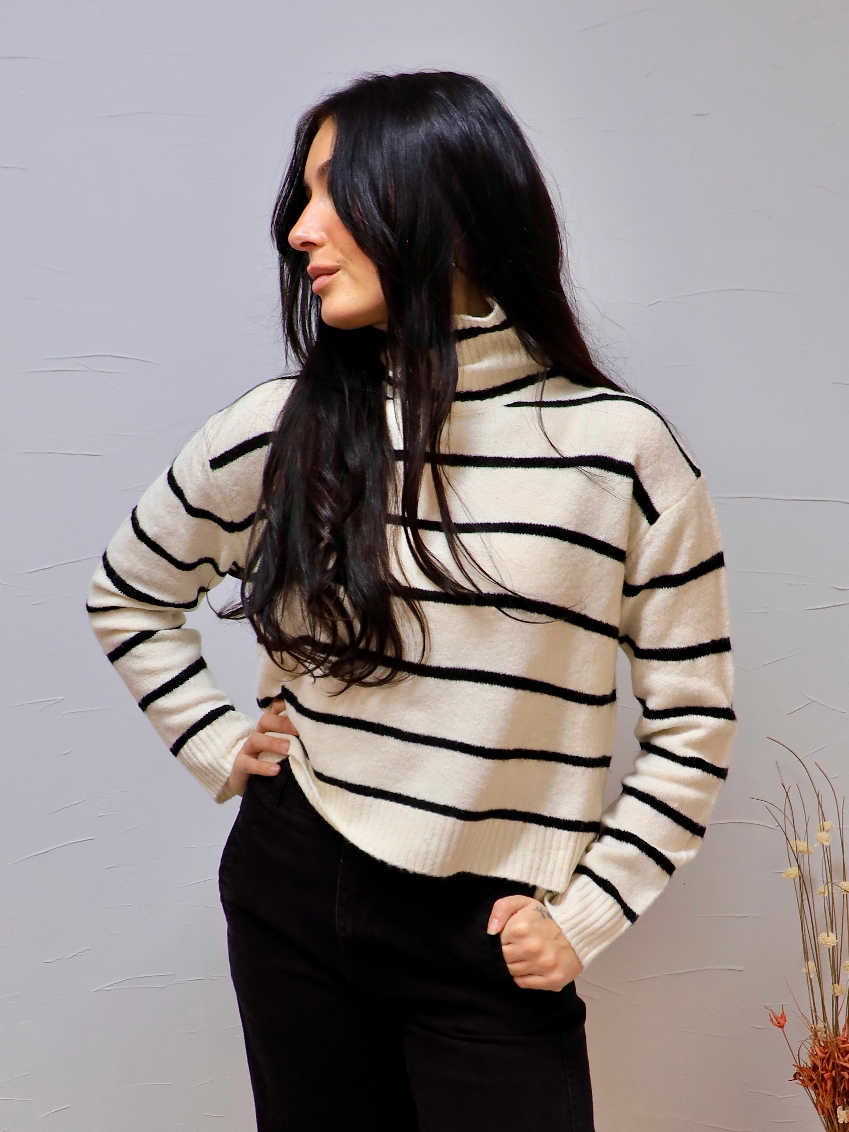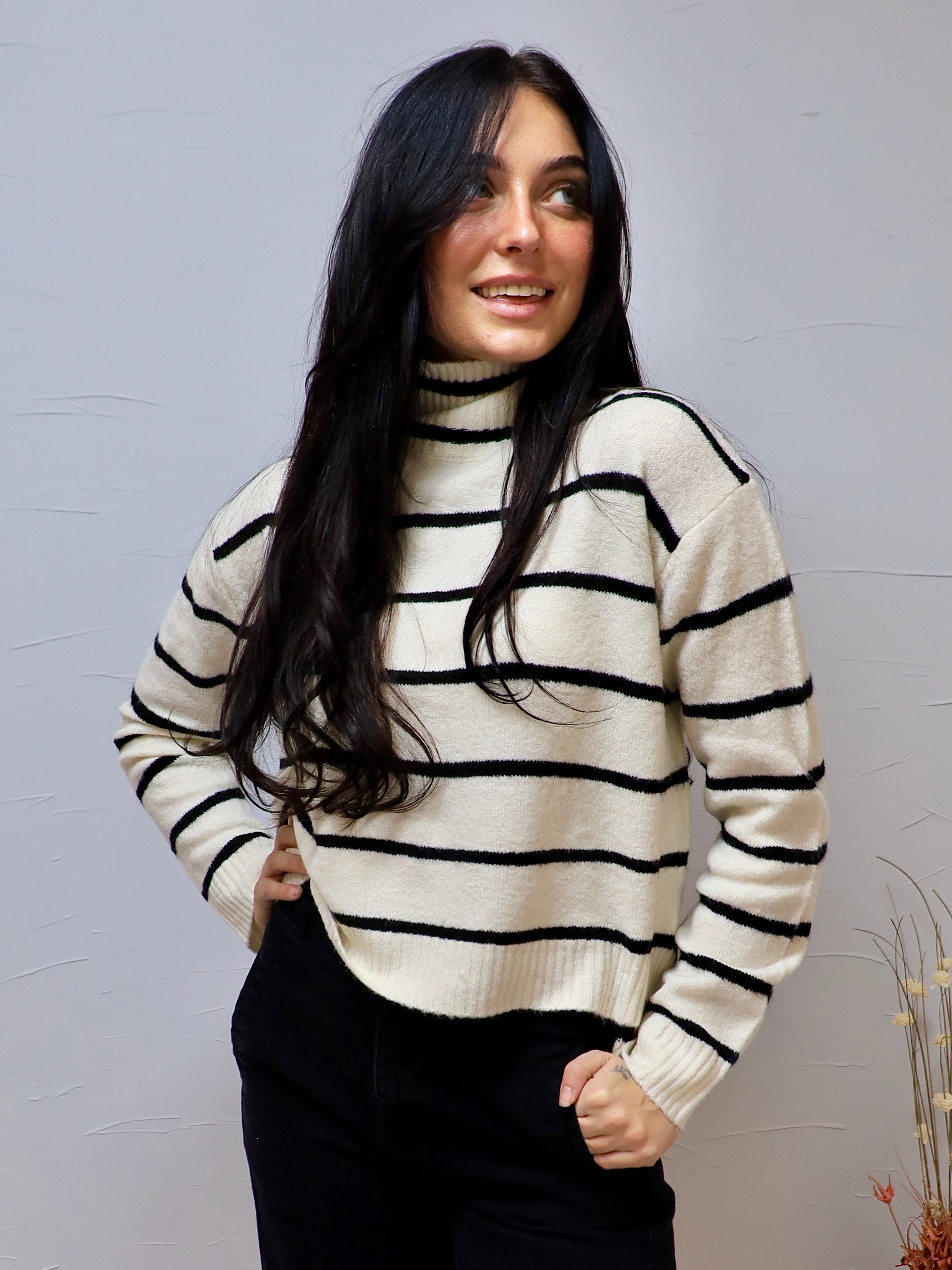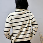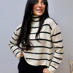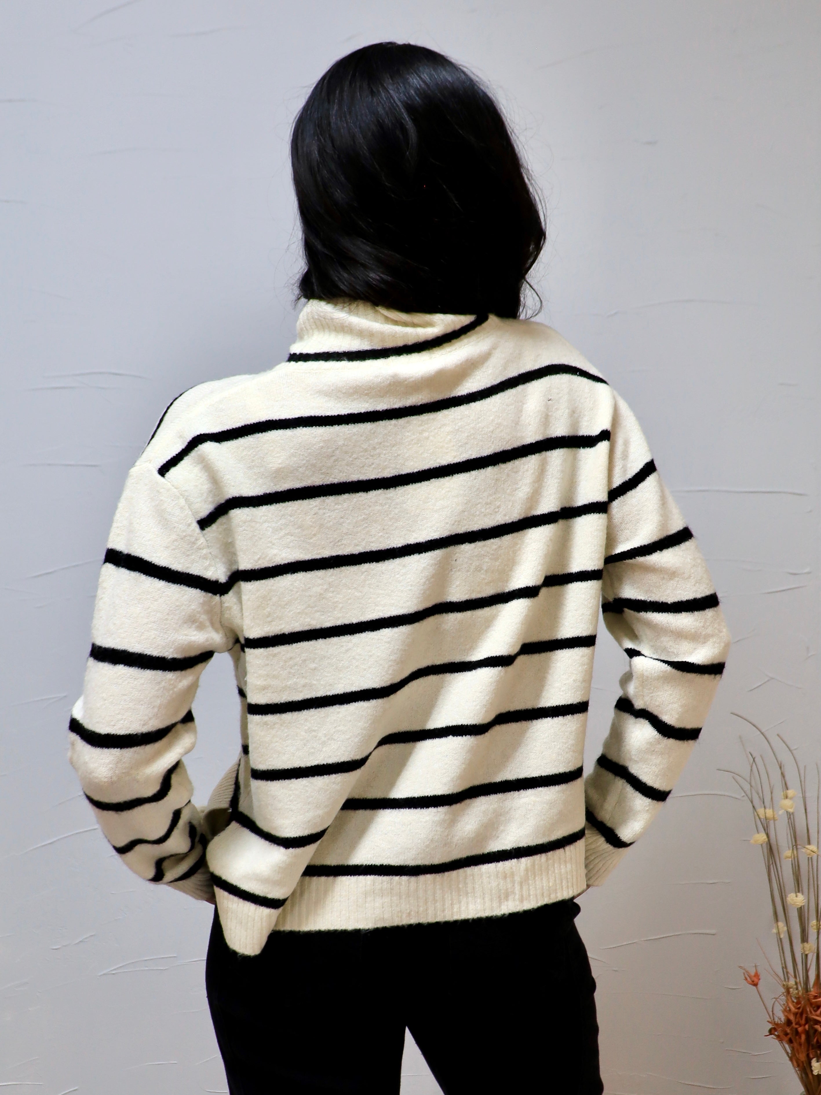 This season, wearing a basic sweater with trendy stripes and a comfortable neckline will complete your casual, on-the-go look.