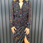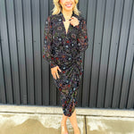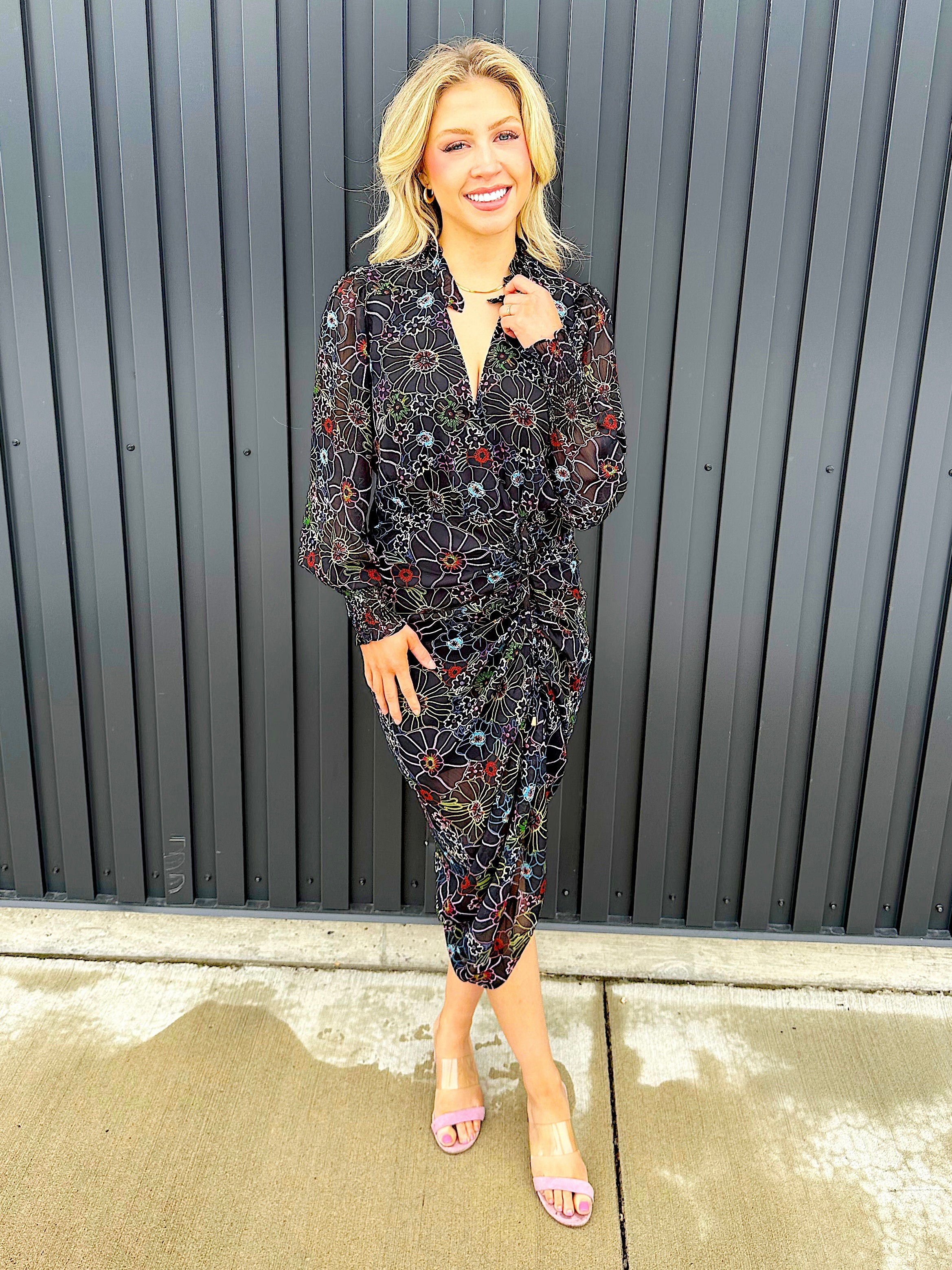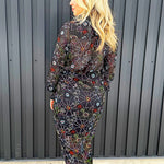- Colorful floral print pops against dark background