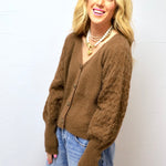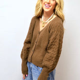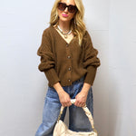This cozy, textured cardigan in a rich brown hue offers a relaxed, modern look with its oversized buttons and soft, plush fabric.