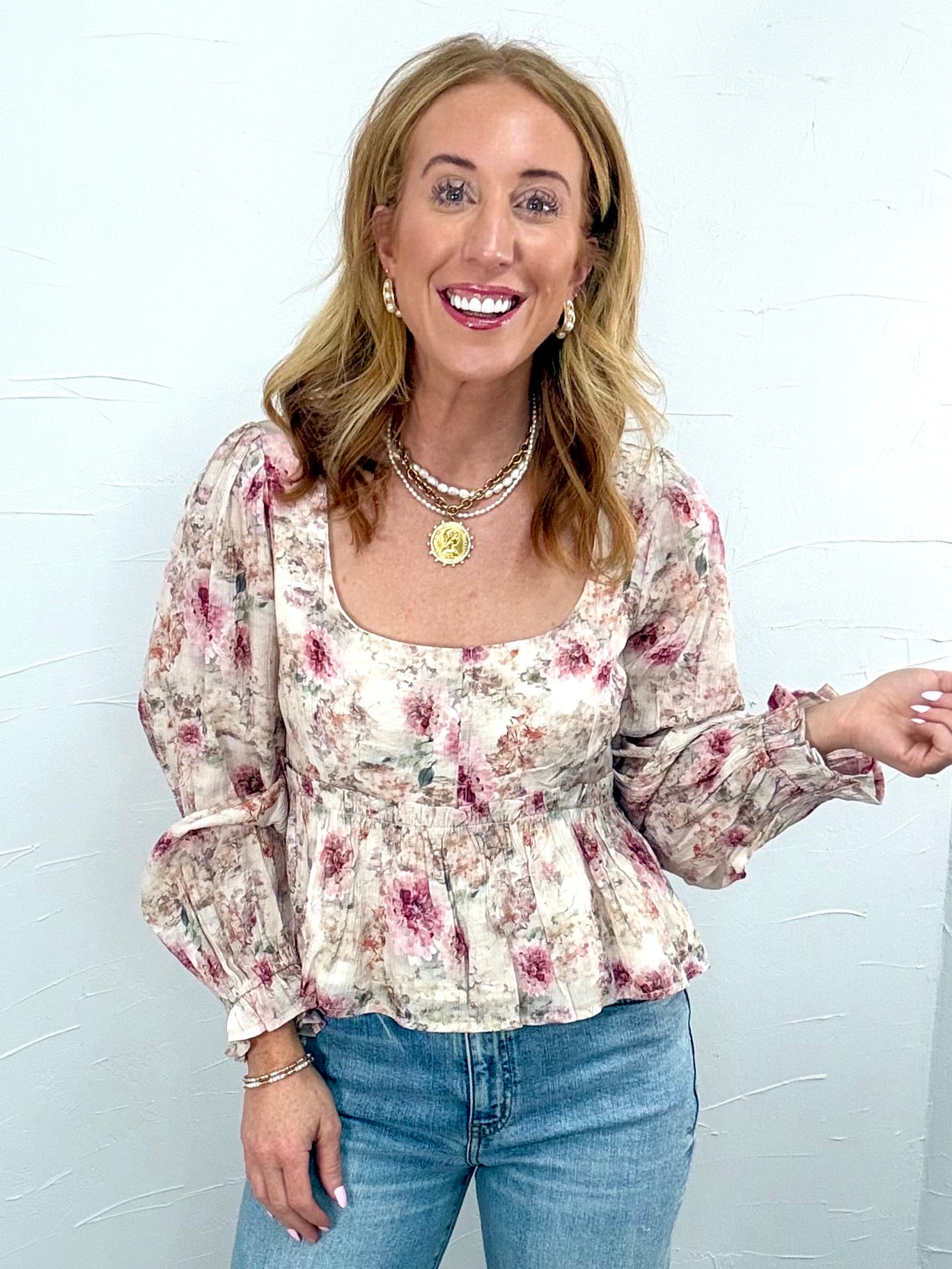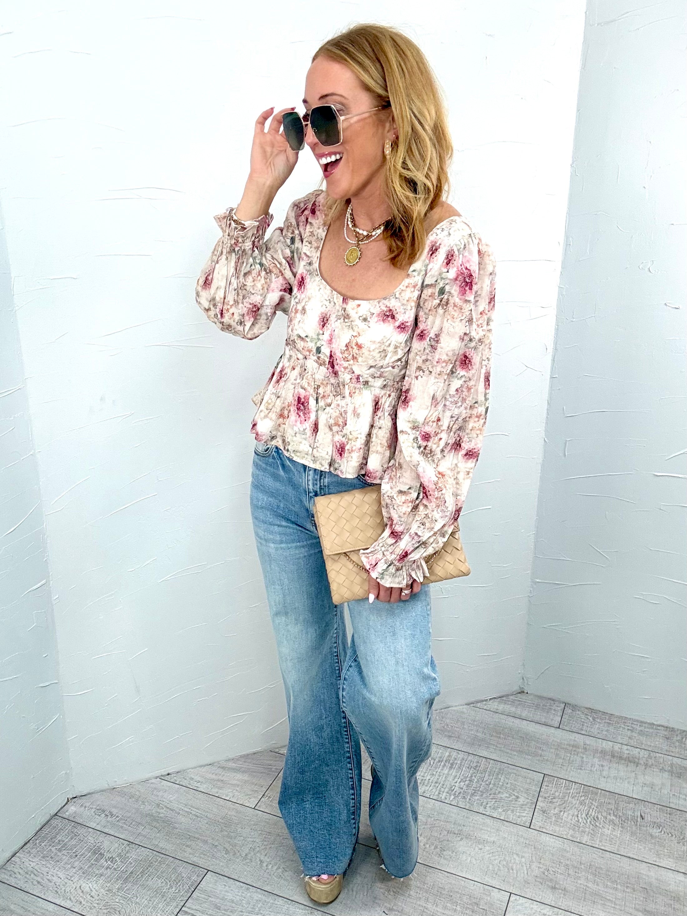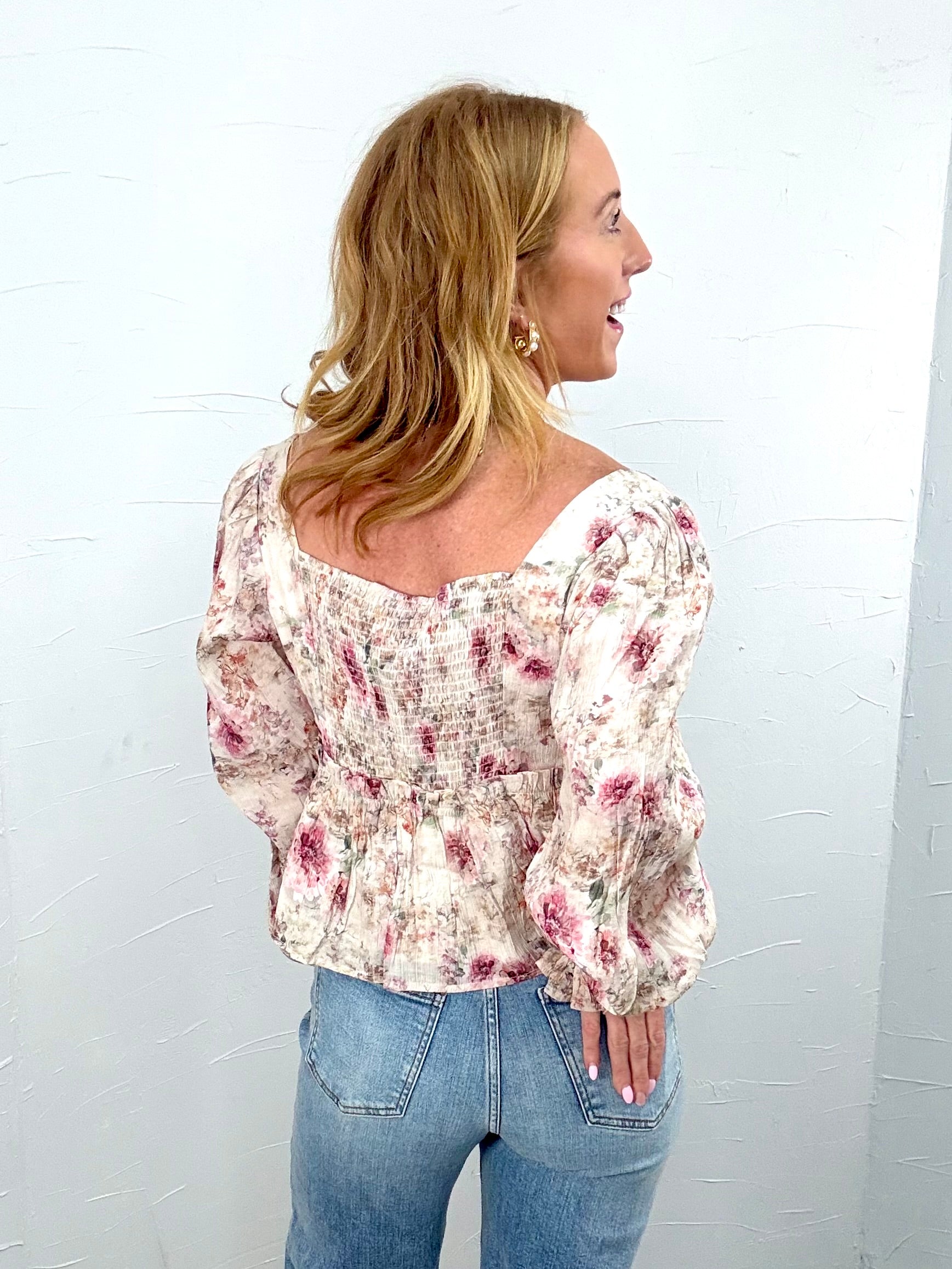 This romantic floral blouse is perfect for brunch dates, baby showers, church, or any moment you want to feel feminine and put together. Pair it with denim and boots for everyday charm or dress it up with trousers and heels for a soft elevated look.