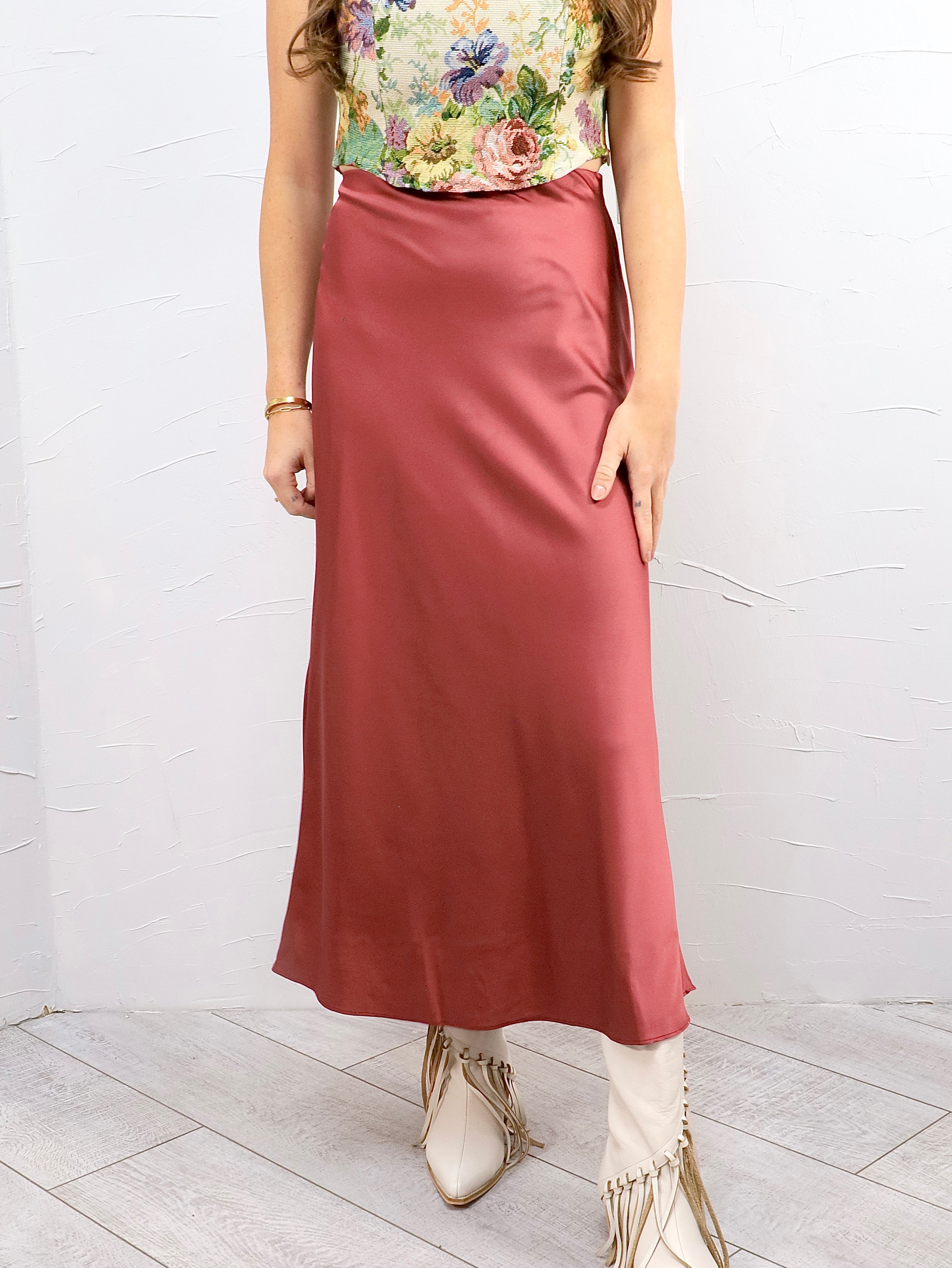 The Dusky Satin Slip Skirt is your go-to for effortless elegance this fall and holiday season. Dress it up with our Maplewood Tapestry Top for a fun girls’ night out or keep it cozy by layering with your favorite snug sweater for those chillier days.