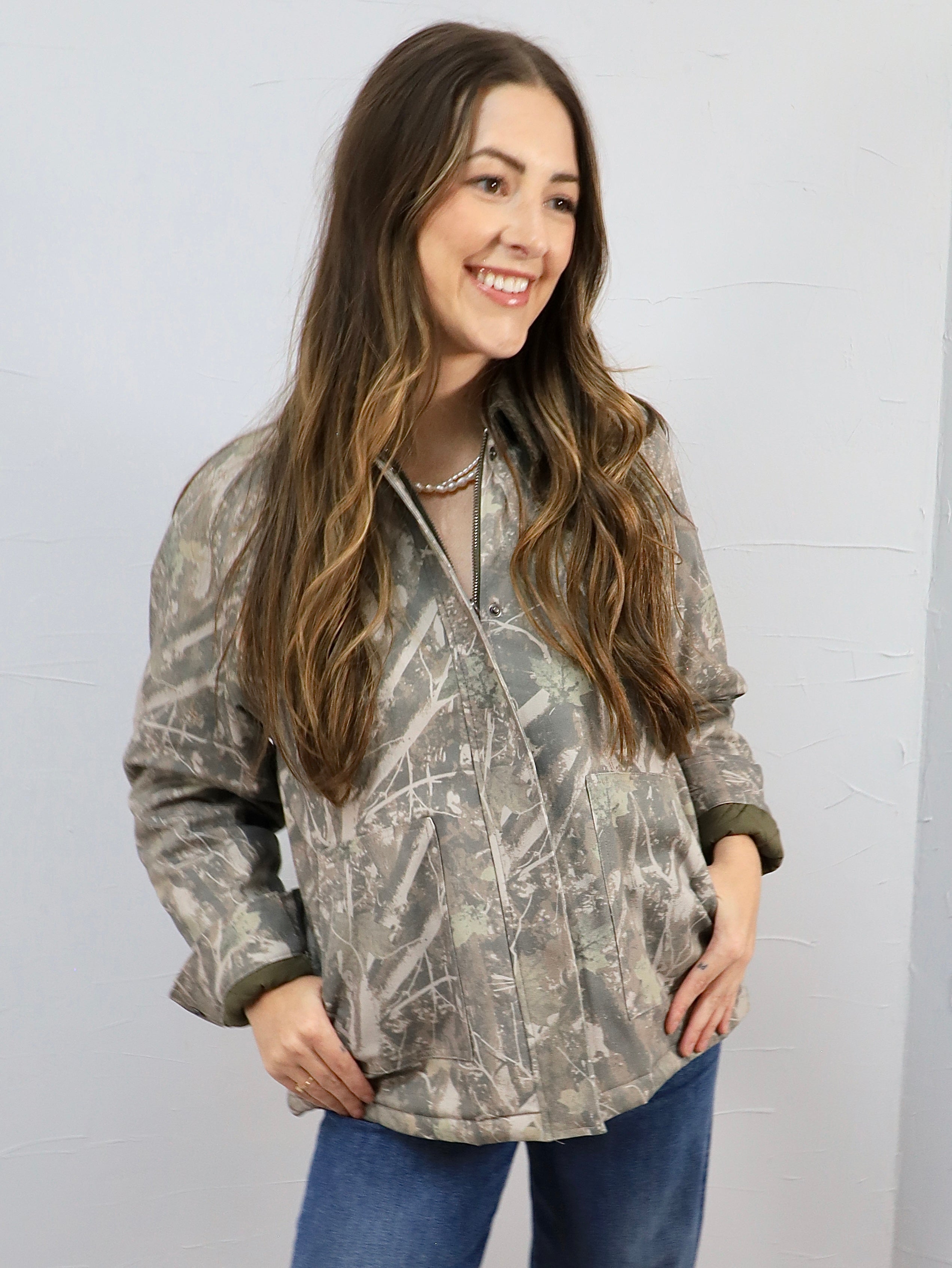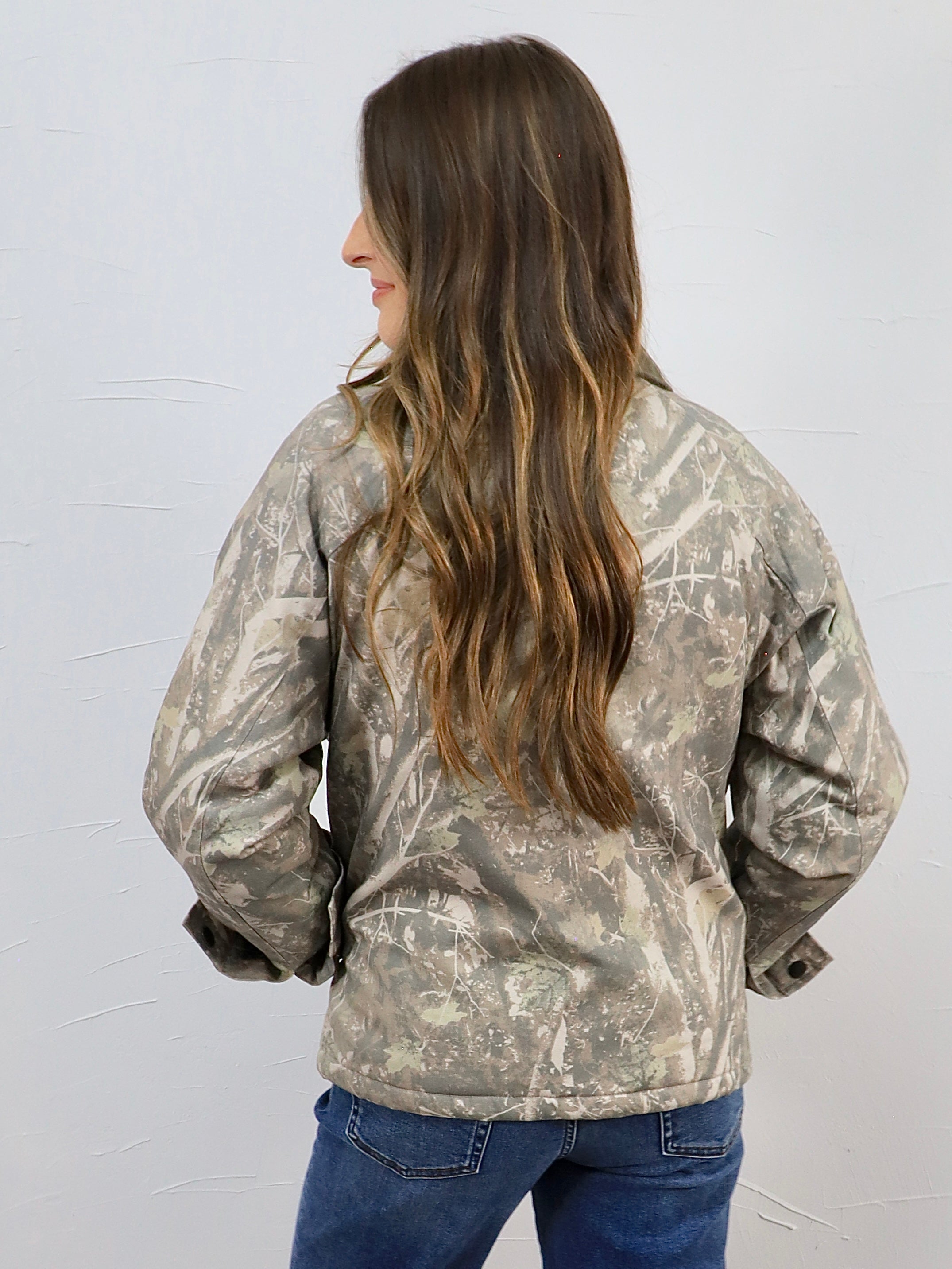 Stay cozy and stylish with Korie's Camo Jacket, a perfect mix of workwear toughness and fashion flair. Fully insulated, this jacket keeps you warm while helping you blend in effortlessly—because who says you can’t look good while staying practical?