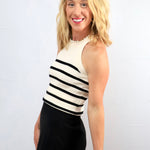 Who says basics have to be boring? Vanessa's Striped Tank proves otherwise with its playful halter like neckline, while the classic black and white stripes keep it a versatile, everyday favorite.