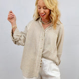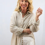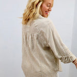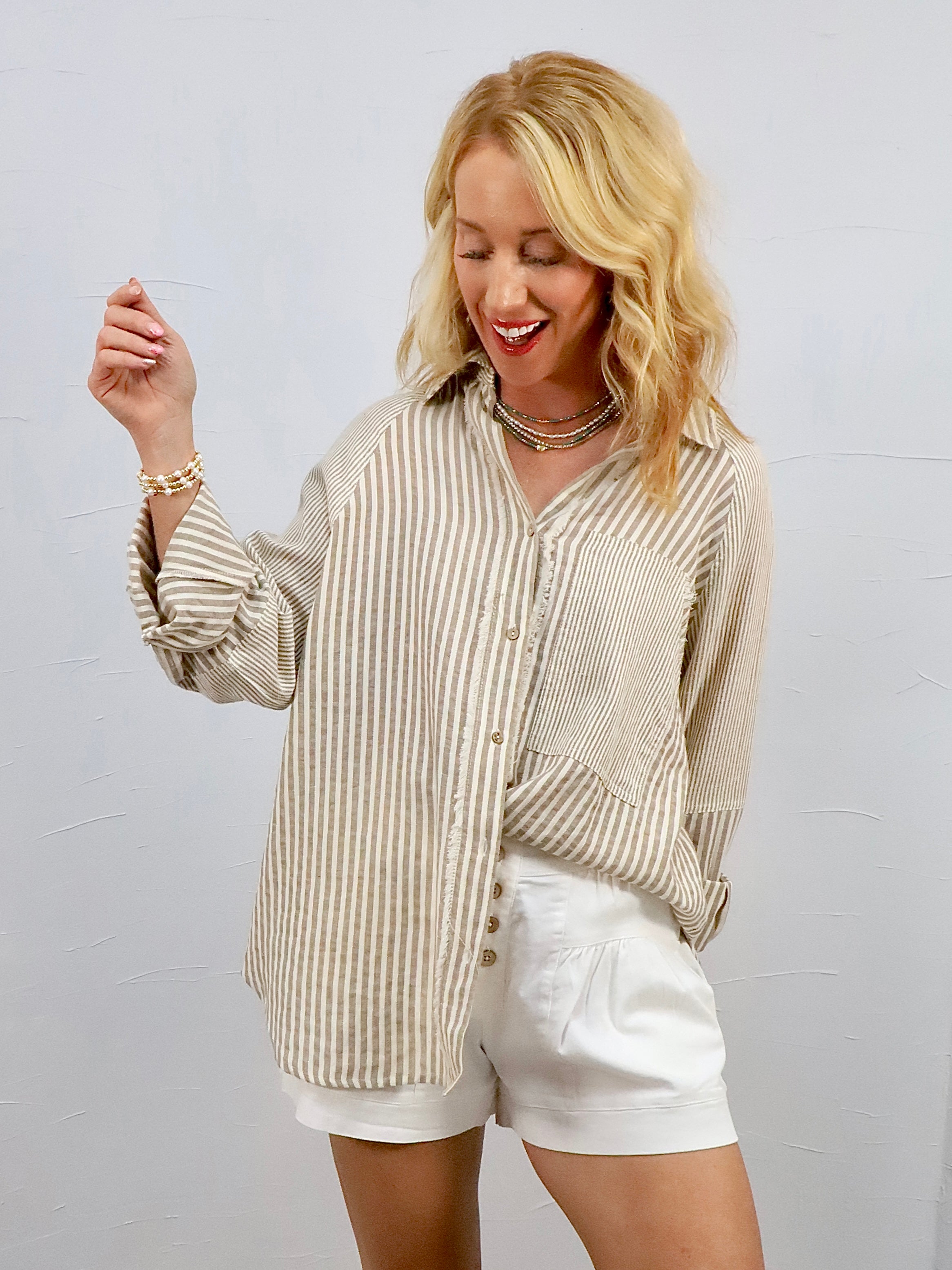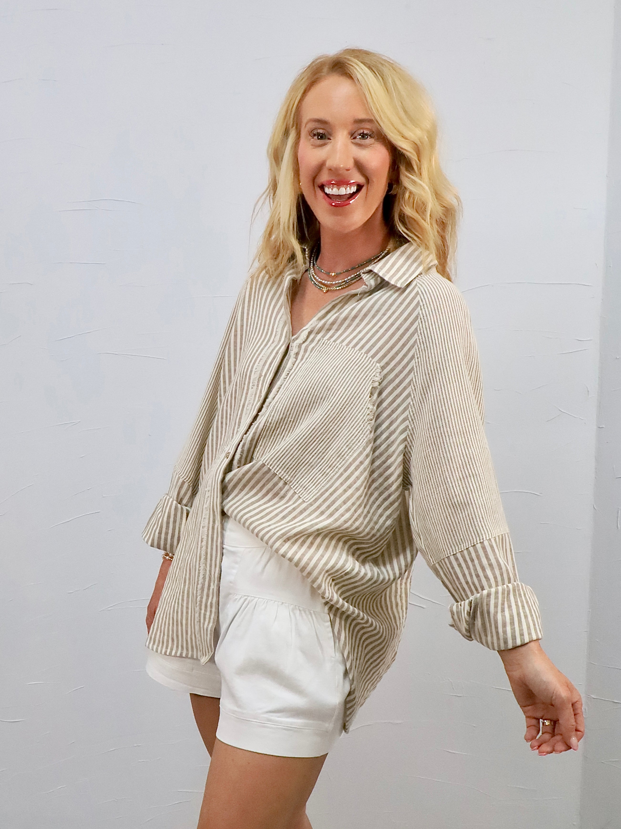 As the evenings cool down on these summer days, this button down will be your go-to to keep warm. Throw on over a swimsuit for those lake days, or dress up with our whote flowy shorts and a side tuck for a park date with the kids.