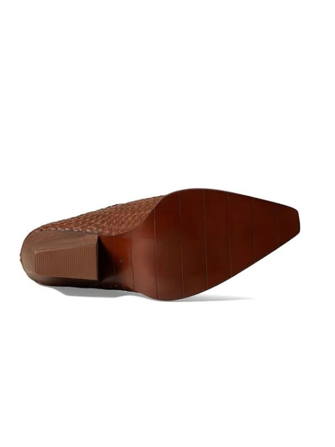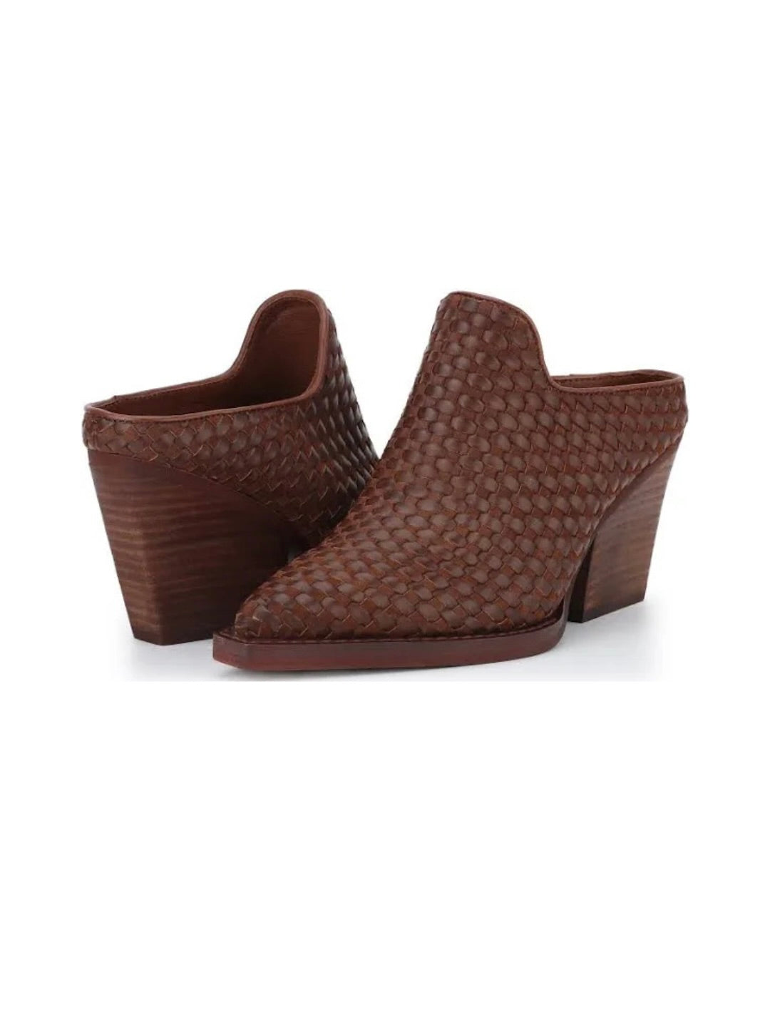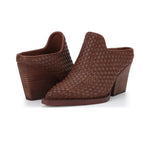 Effortlessly stylish Dana Bootie in rich brown features intricate woven detailing for distinctive texture and visual interest. This versatile slide-on shoe boot combines convenience with craftsmanship, offering a true-to-size fit that ensures all-day comfort without sacrificing sophisticated appeal. Perfect for elevating casual outfits or complementing more polished looks.
