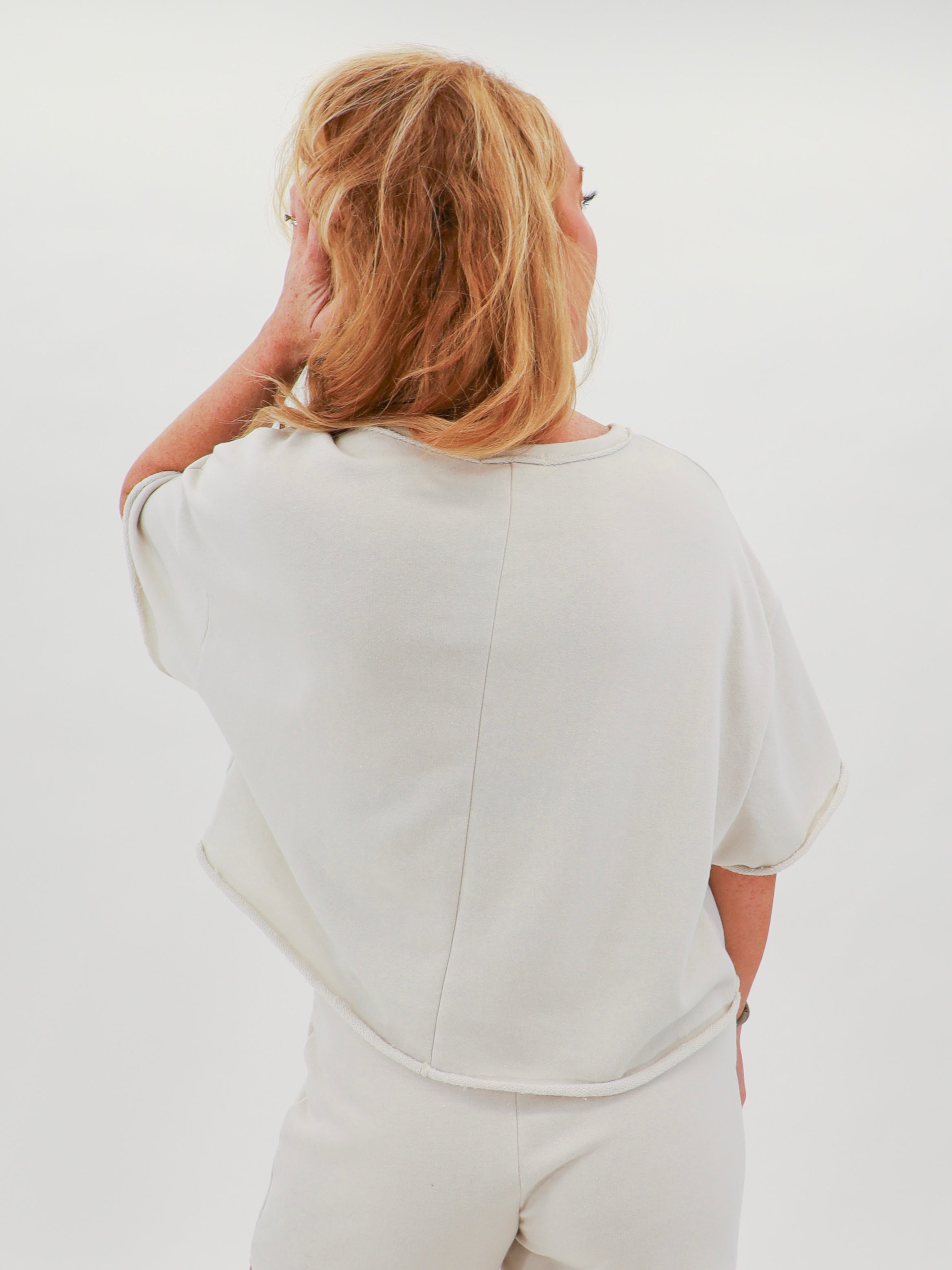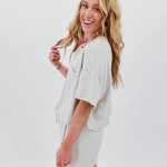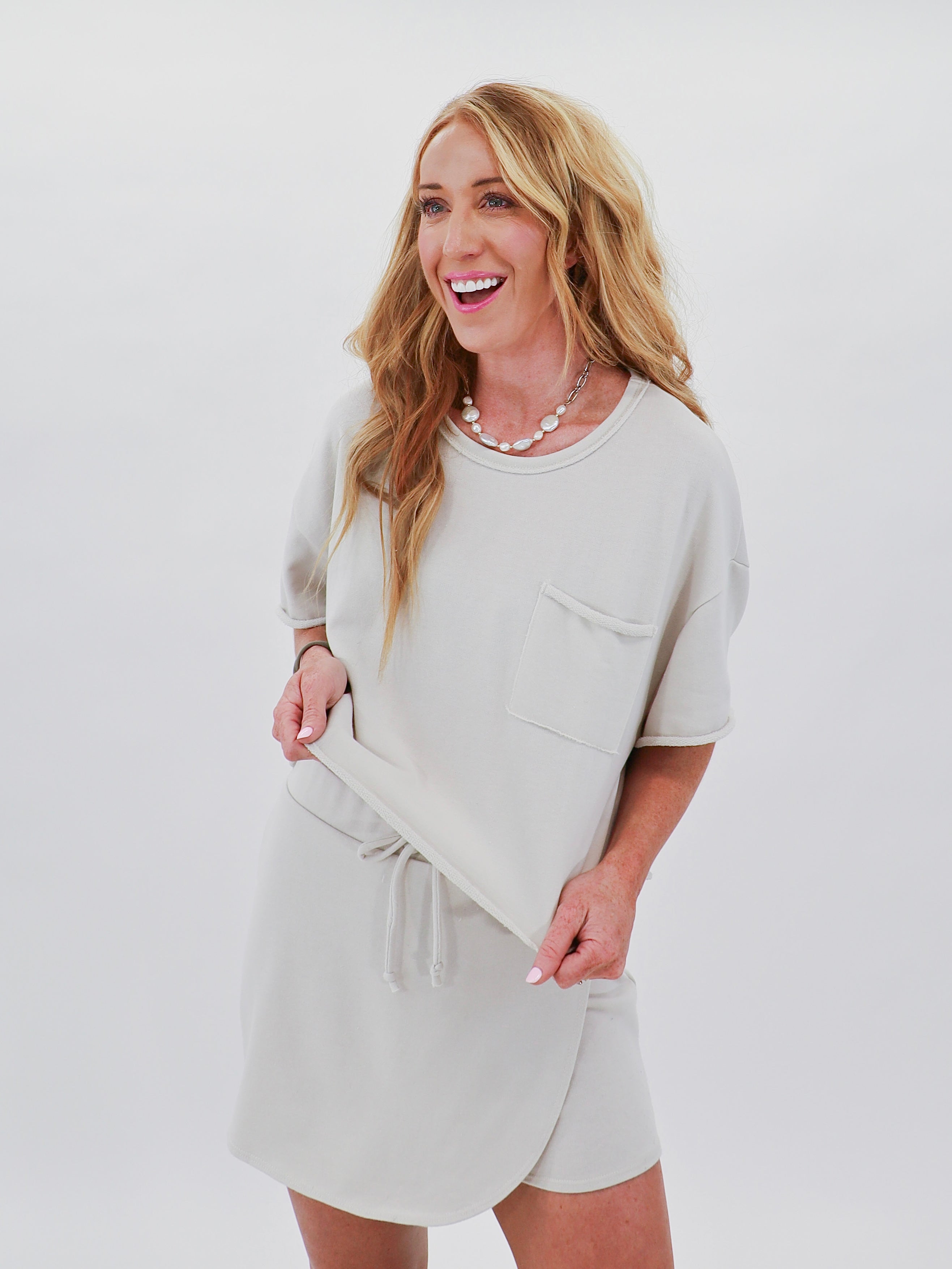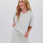 Get ready for the ultimate combination of comfort and style with this effortlessly cool top. It may seem basic at first glance, but the unique material and playful pocket detail add an unexpected twist. Pair it with the matching skort or some distressed denim shorts, throw on your favorite tennis shoes, and you'll be ready for your next play date!