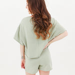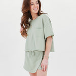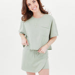 Get ready for the ultimate combination of comfort and style with this effortlessly cool top. It may seem basic at first glance, but the unique material and playful pocket detail add an unexpected twist. Pair it with the matching skort or some distressed denim shorts, throw on your favorite tennis shoes, and you'll be ready for your next play date!